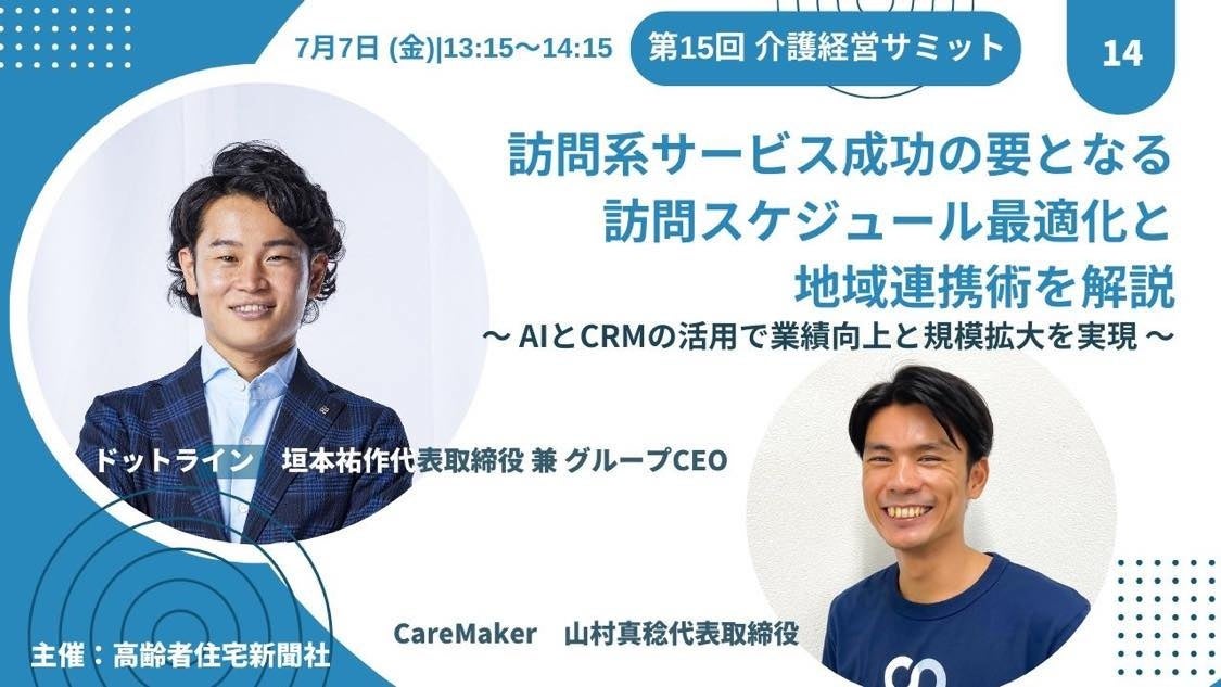 株式会社ドットライン 代表取締役 兼 グループCEO 垣本 祐作 氏とともに、「訪問系サービス成功の要となる訪問スケジュール最適化と地域連携術を解説」と題し、最適なスケジュールによる稼働率向上や地域連携強化による依頼数増加など生産性を最大化する仕組みについて、実例や導入効果を交えながらご紹介します。