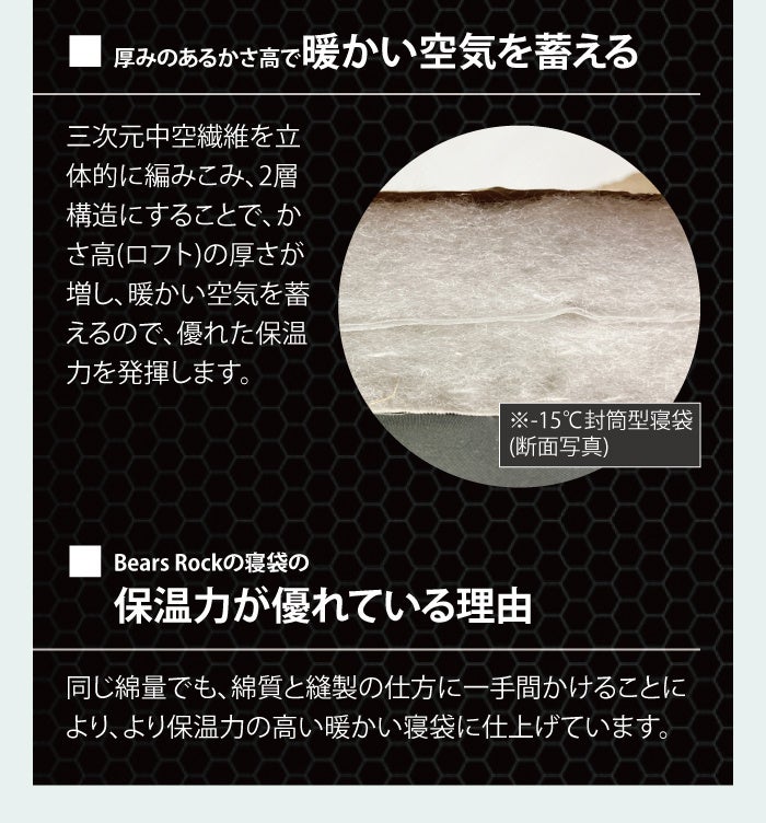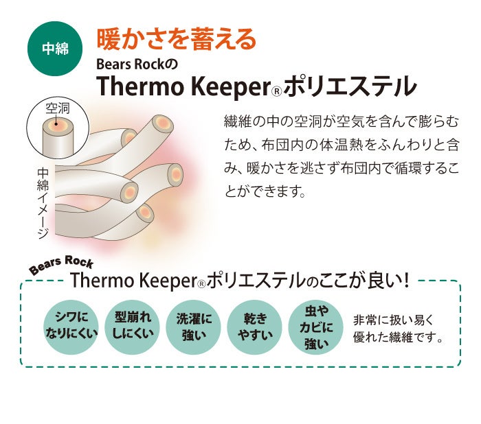 中綿で使用しているBears Rock Thermo Keeper®ポリエステルは、型崩れしにくく、