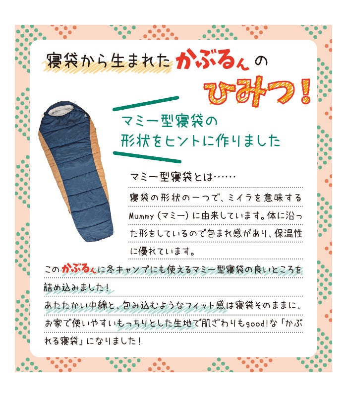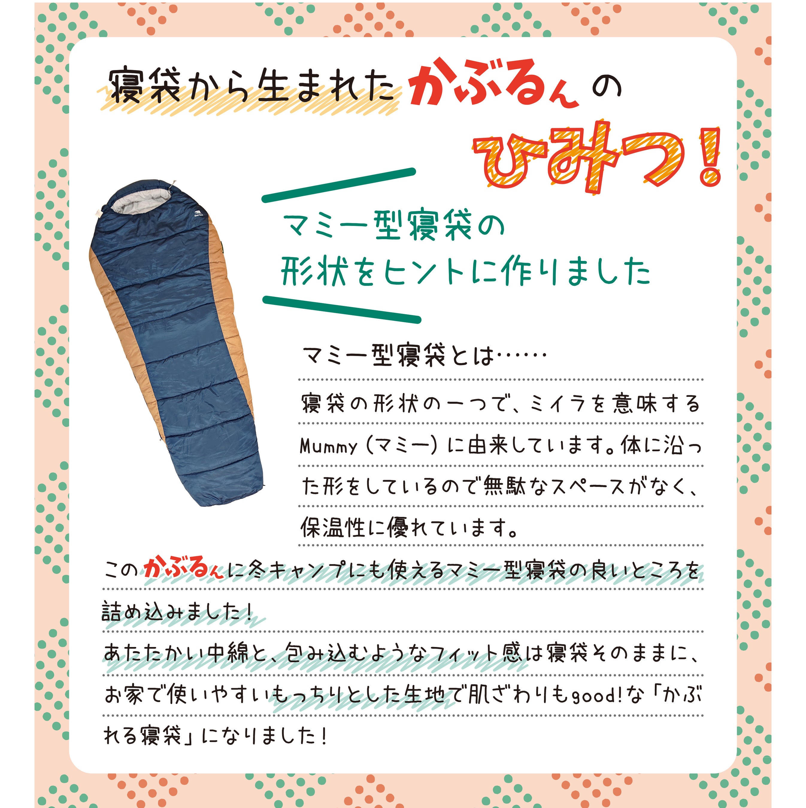 マミー型の寝袋を普段の寝具におすすめすることも考えましたが、寝袋を普段使いするのに抵抗がある方もいらっしゃいますし、布団の好みも人それぞれです。そこで、マミー型の寝袋の胸から上の部分だけを切りとれば、頭や肩の寒いところだけをカバーし、自分好みの布団やシーツを使うことができると考え、この「かぶるん」が誕生しました。