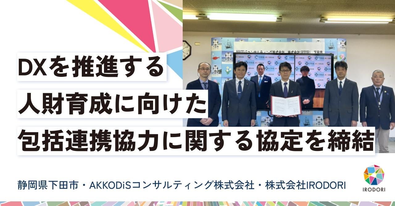 全国の自治体や企業とともに社会課題解決に繋がる事業の創造を行う株式会社IRODORI(代表取締役社長:谷津 孝啓 )は、企業および組織へエンドツーエンドのコンサルティングサービスを提供するAKKODiSコンサルティング株式会社(本社:東京都港区、代表取締役社長:川崎 健一郎)、静岡県下田市(市長:松木 正一郎)の三者は、1月15日、「DXを推進する人財育成に向けた包括連携協定」を締結しました。