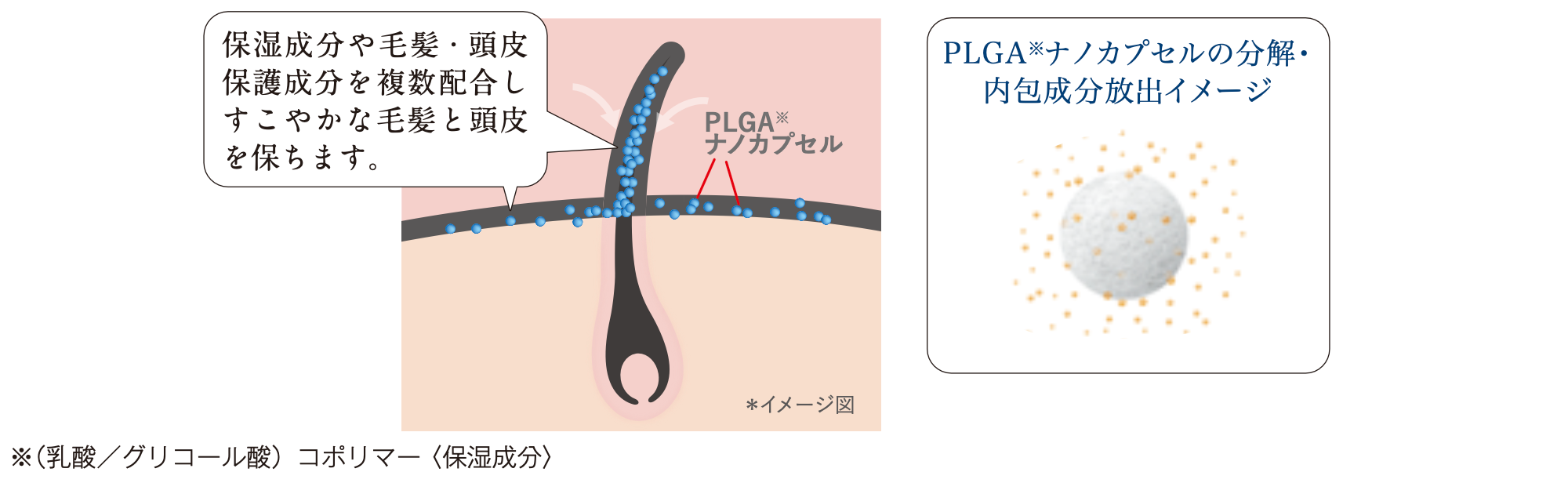 育毛剤にも配合されている髪と頭皮のケア成分を15種類配合 、PLGA*2 ナノカプセルで長時間成分を届け続ける!