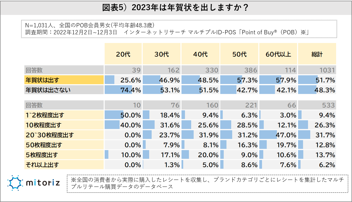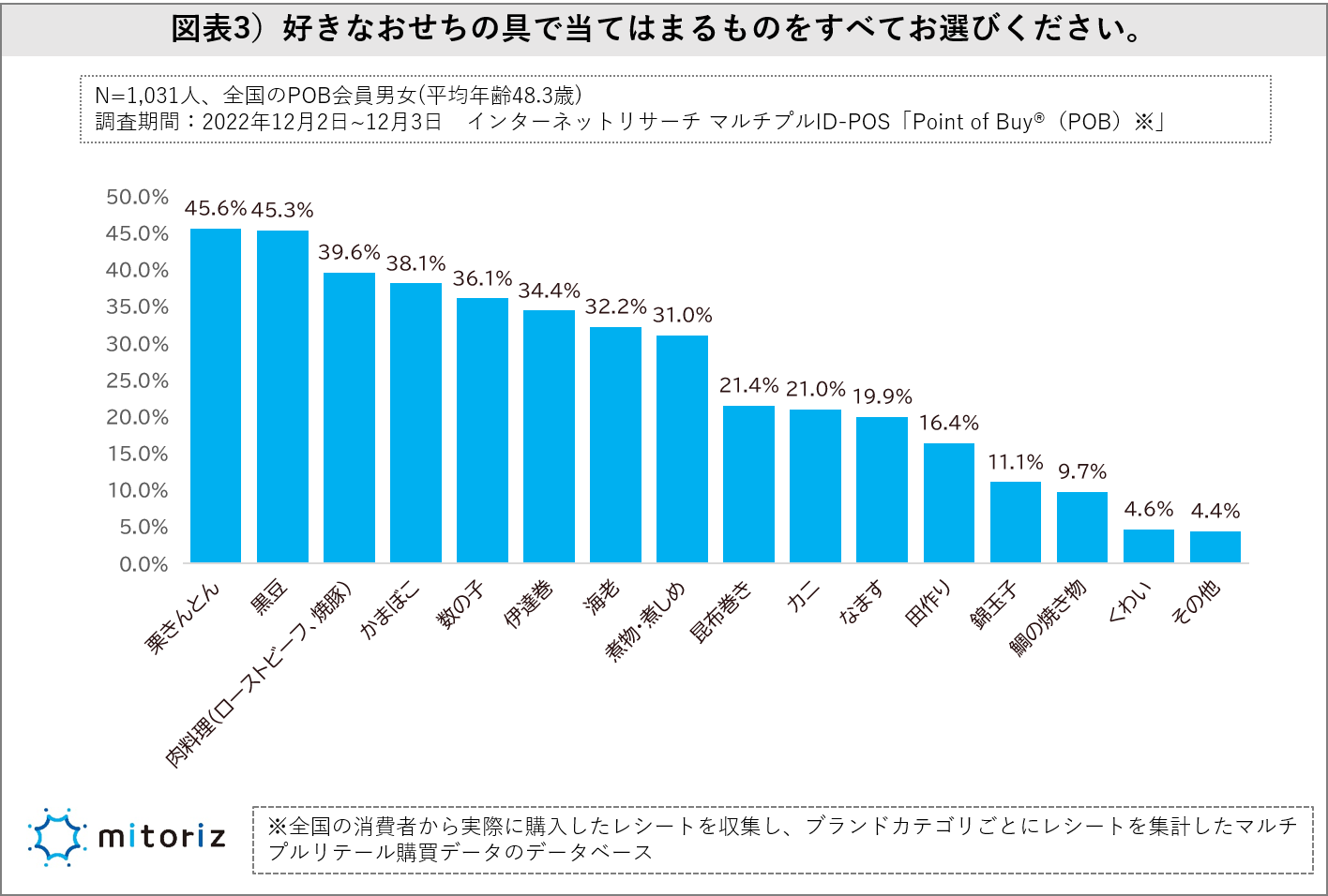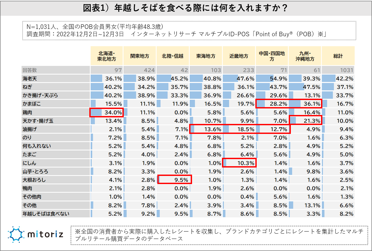 株式会社mitoriz(本社:東京都港区、代表取締役社長:木名瀬博)は、消費者購買行動レポートデータサービス「Point of Buy®(以下、POB)」の会員1000名に「年末年始の過ごし方」に関するアンケートを実施しました。年末年始に食べる定番の「年越しそば」や「おせち」について、お正月の風物詩「年賀状」に関する調査を行ったところ、「年越しそば」や「おせち」の意外な人気具材の存在、若者の年賀状離れを実感させる結果となりました。