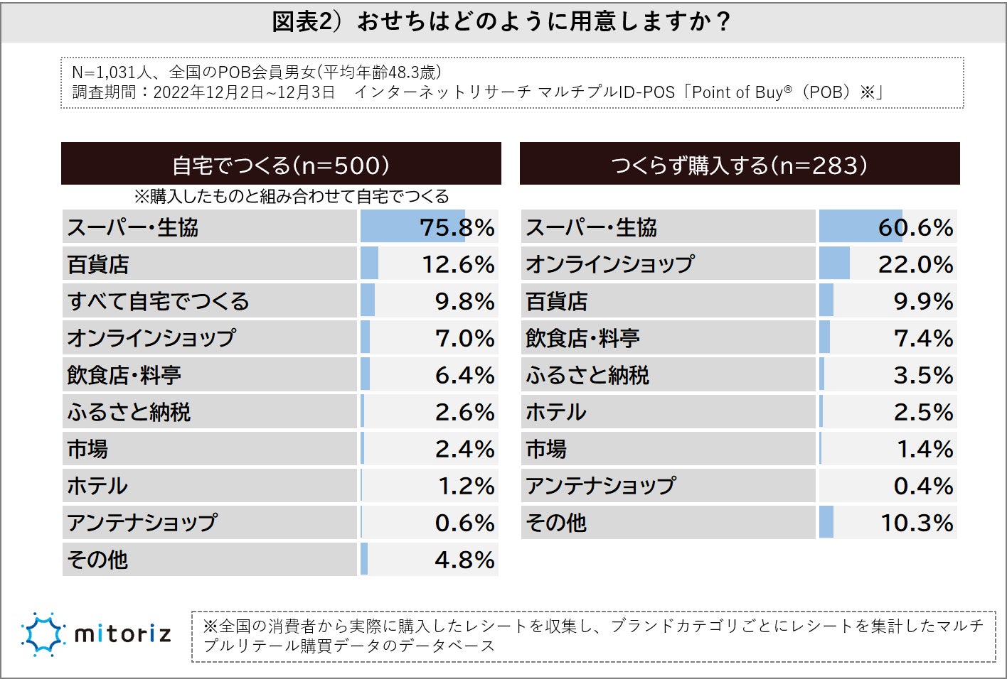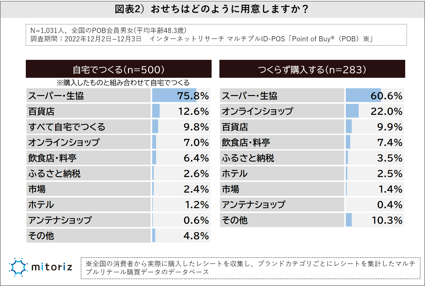 おせちの用意で利用する店は「つくる派」・「購入する派」どちらも「スーパー・生協」の利用がトップ