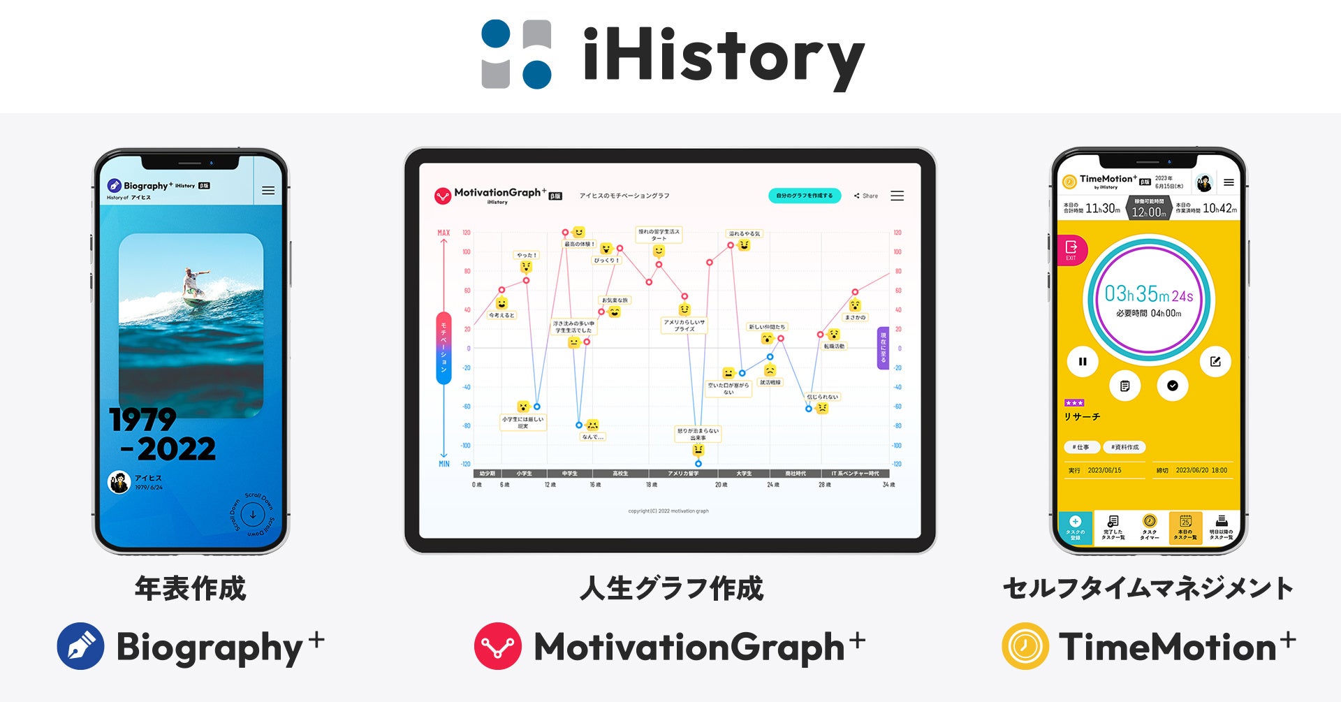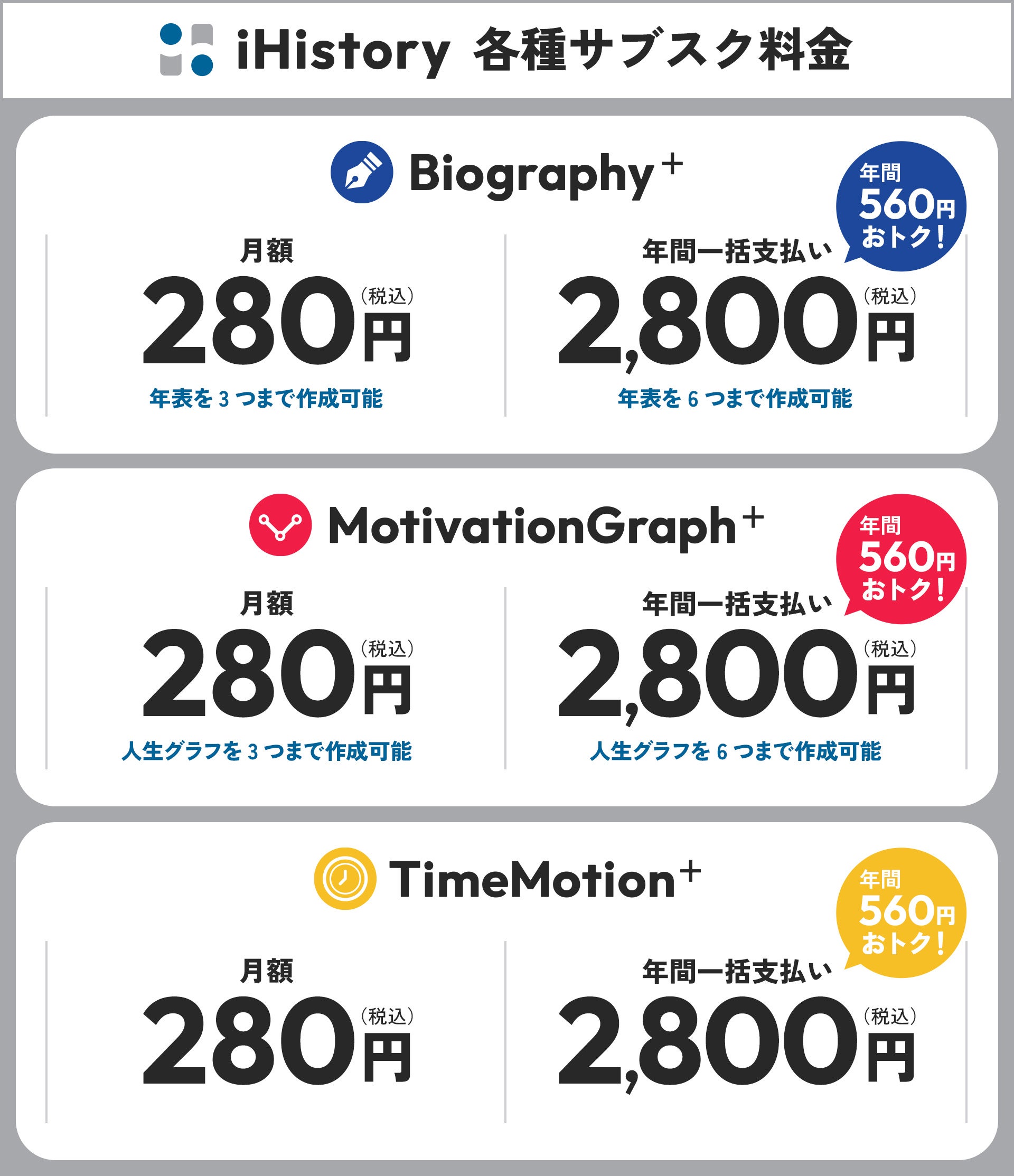 先日リリースした年表作成サービス『Biography+』と、人生の浮き沈みグラフ作成サービス『MotivationGraph+』、『 TimeMotion+ 』が、それぞれの月額280円(税込)のサブスクで、ご利用いただけます。