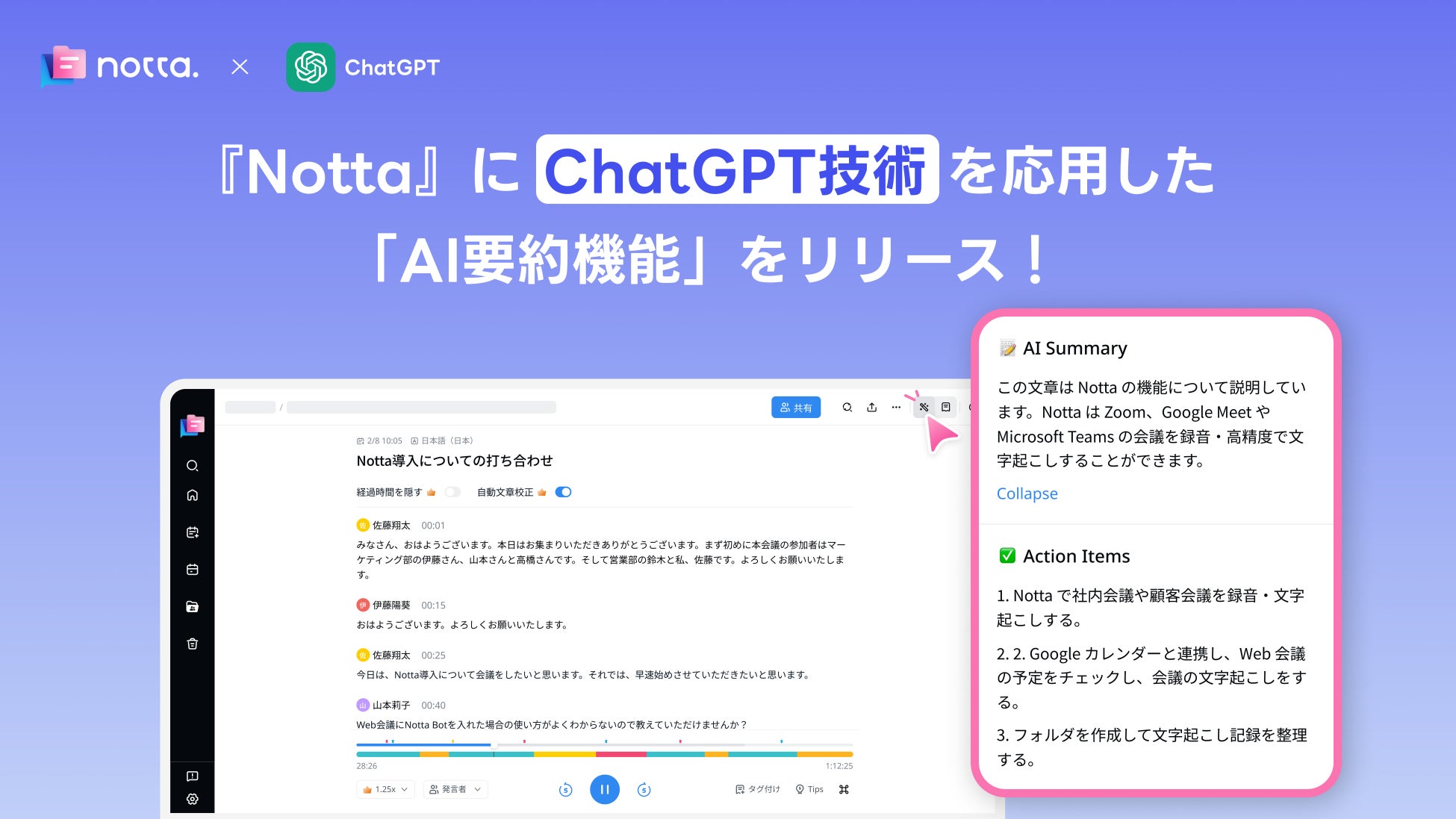 AI文字起こしサービス『Notta』にChatGPT技術を応用した「AI要約機能」をリリース!
