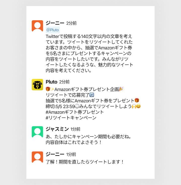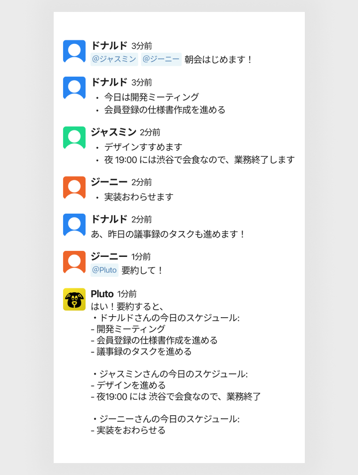 今回発表した「Pluto(プルート)」は、お使いのSlackワークスペースに導入するだけで、AIチャットボットとして利用者さまのSlack上での要約、ブレインストーミング、文章作成・添削、翻訳、コーディングなどを支援します。
