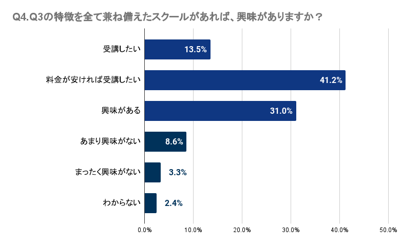Q4で「Q3の特徴を全て兼ね備えたスクールがあれば、興味がありますか?」と質問したところ、13.5%が受講を希望し、41.2%は料金が手頃であれば受講したいと考えています。さらに、31.0%は興味を示していると回答しました。多くの人がこのような特徴を持つスクールに一定の興味を示していることが分かります。
