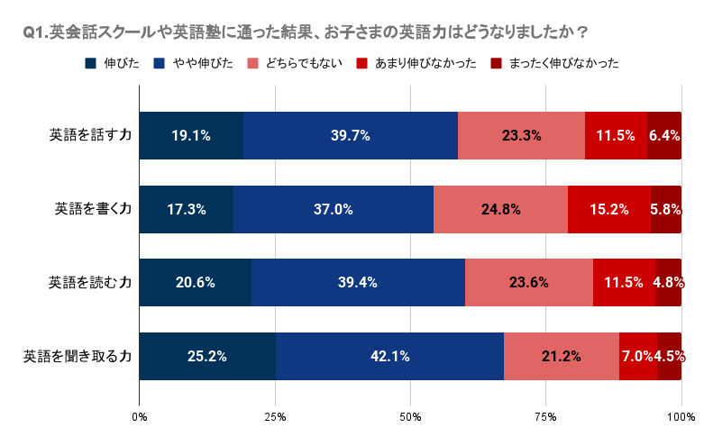 Q1で「英会話スクール、英語塾に通った結果、お子さまの英語力はどうなりましたか?」と質問したところ、英会話スクールや塾に通って英語のスキル向上を明確に感じられなかったと感じている人が一定数いることが分かりました。具体的には、英語を話す、書く、読む、聞き取る各スキルにおいて、「伸びた」と感じる人は20%前後であり、一方で「あまり伸びなかった」や「まったく伸びなかった」と回答した人が合わせて約15%〜20%となっています。特に、英語を書く力においては「あまり伸びなかった」と「まったく伸びなかった」の合計が20%を超えています。また、各スキルに関して「どちらでもない」と答えた人も含めると、約30~40%となっており、明確な効果を実感していない人が一定数存在することが伺えます。