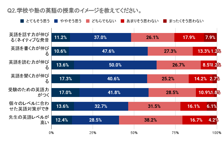Q1・Q2では、子どもが英会話スクールや英語塾に通っていたが英語力アップの効果を感じていない人が一定数いること、学校や塾の英語の授業に対して明確な効果や良い印象を持てていない人が多いことが明らかになりました。