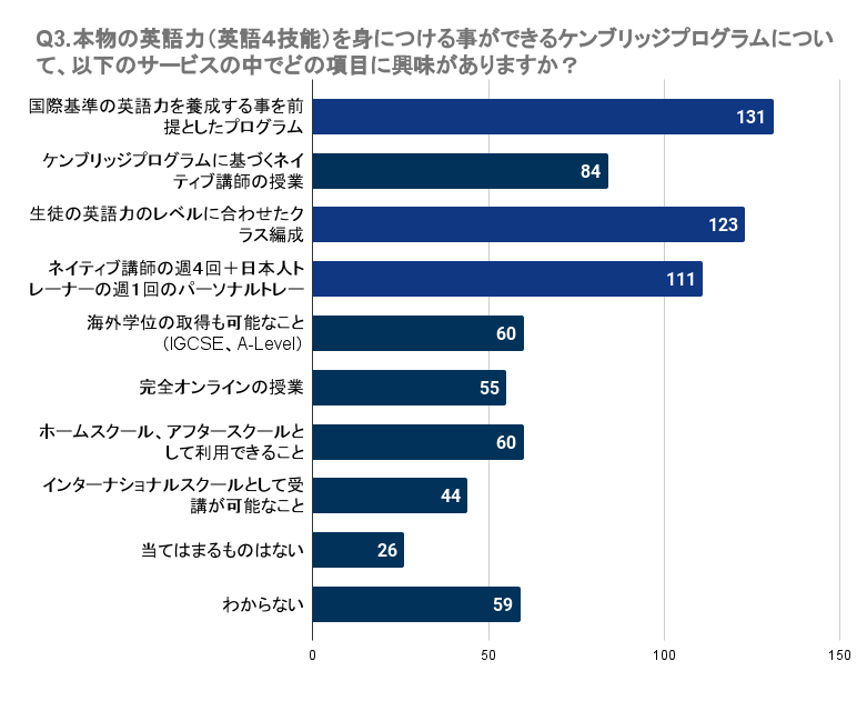 Q3で「本物の英語力(英語4技能)を身につける事ができるケンブリッジプログラムについて、以下のサービスの中でどの項目に興味がありますか?(複数回答可)」と質問したところ、最も多かったのは「国際基準の英語力を養成する事を前提としたプログラム」で131名でした。次いで、「生徒の英語力のレベルに合わせたクラス編成」には123名、「ネイティブ講師の週4回+日本人トレーナーの週1回のパーソナルトレーニング」には111名が興味を持っています。一方で、「インターナショナルスクールとして受講が可能なこと」や「完全オンラインの授業」に関心を持つ人はやや少なめで、それぞれ44名、55名の回答でした。これらの結果から、多くの人は実用的な英語力の養成や個別のニーズに応じた指導に重きを置いていることが伺えます。