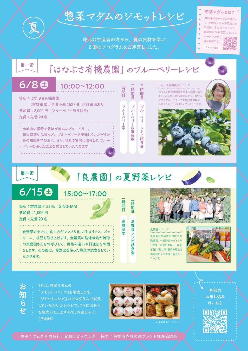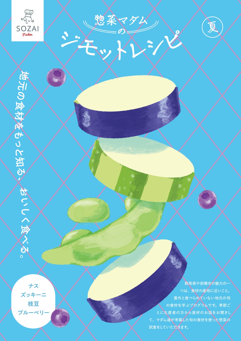 料理好きの市⺠が集まって、食材や料理を学びながらお惣菜店の開業を⽬指すプロジェクト「惣菜マダム」。昨年度の料理教室に続いて、今年度は地元で採れる旬の食材を学び、レシピを開発する「ジモットレシピ」を季節ごとに全4回開催します。第1回目の「夏」はナス、ズッキーニ、枝豆などの夏野菜とブルーベリーを取り上げて生産者さんから直接お話をお聞きするセミナーを開催。7月には、「ジモットレシピ」のプログラムで試食していただいたレシピでお弁当を販売いたします。(予約制)