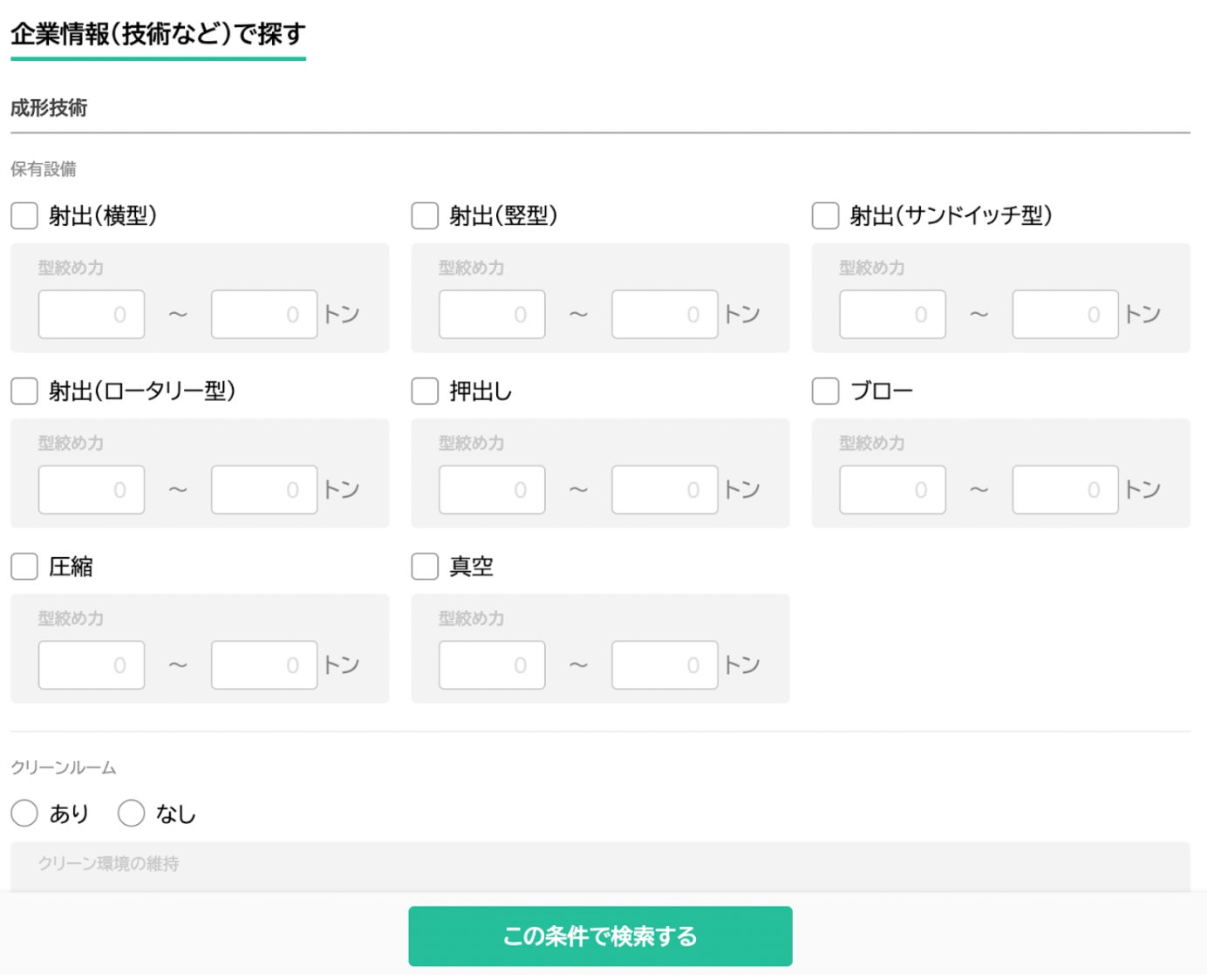 保有設備、クリーンルーム、実績業界・用途、取扱実績樹脂、金型調達、加工対応、各種フィラー入り対応、所在地、GHG量など、専門性が高い項目検索が可能です。