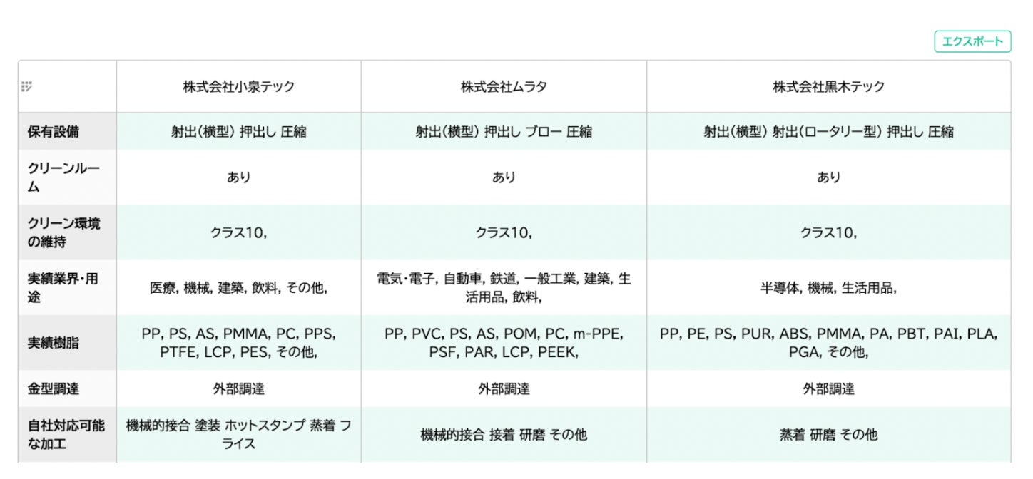 Sotas DBは、資本金や所在地などの企業情報だけではなく、保有設備、クリーンルームの有無、実績業界・用途、取扱実績樹脂、金型調達、加工対応、各種フィラー入りの対応、など詳細情報を網羅し、情報を一箇所に集約。化学商社にとってピンポイントで探したい企業を見つけることができ、各社の比較検討表が簡単に作成できる情報データベースです。