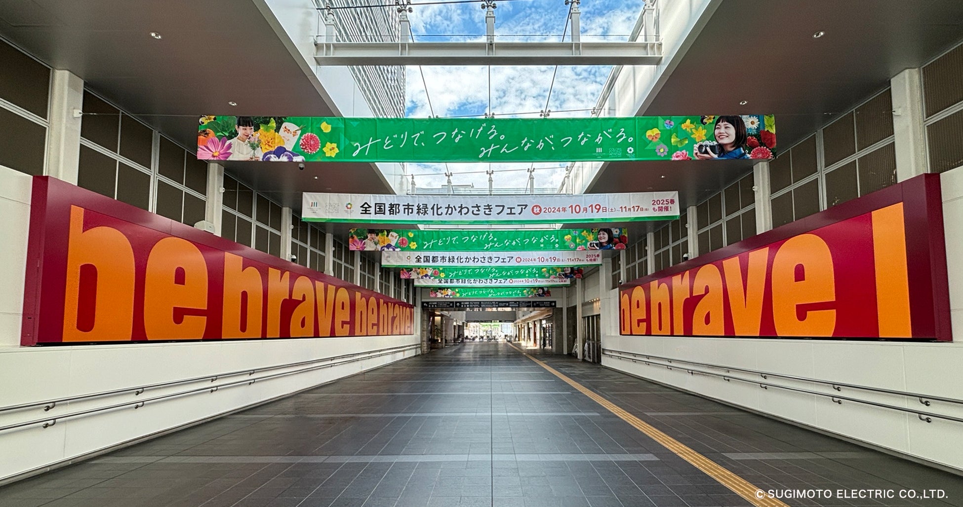 杉本電機産業株式会社は、2024年5月に実施された「JR川崎駅北口通路における広告運用事業事業者選定に係る公募型プロポーザル」*で事業者選定された川崎ブレイブサンダースのオフィシャルスポンサーとして「川崎新!アリーナシティ・プロジェクト」に賛同し、2028年開業予定である新アリーナの玄関口となる川崎駅北口通路へのLEDビジョン新設における設計・製作・施工を担当しました。