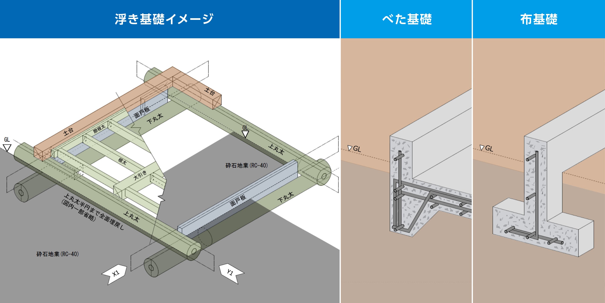木製浮き基礎工法は、従来のコンクリート基礎(布基礎/べた基礎)から形状や使用する材料が大きく異なるため(下記イメージ図参照)、下記の3項目を中心に審査頂きました。審査は、建築基準法関係法令や技術指針などに照らし合わせることで、当社が設定する新規工法の規定や基準、設計施工方法が必要十分(妥当)か客観的に評価されました。