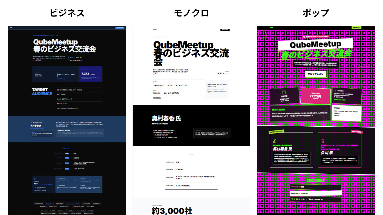 Qubeに登録されたイベントを選択し、「ビジネス」「ラグジュアリー」「ポップ」などのテーマを選ぶだけ。 (※テーマは「ビジネス」「フューチャー」「ラグジュアリー」「ポップ」「モノクロ」「レトロゲーム」の全6種類) AIが選ばれたテーマに合わせて専用LPを自動生成します。