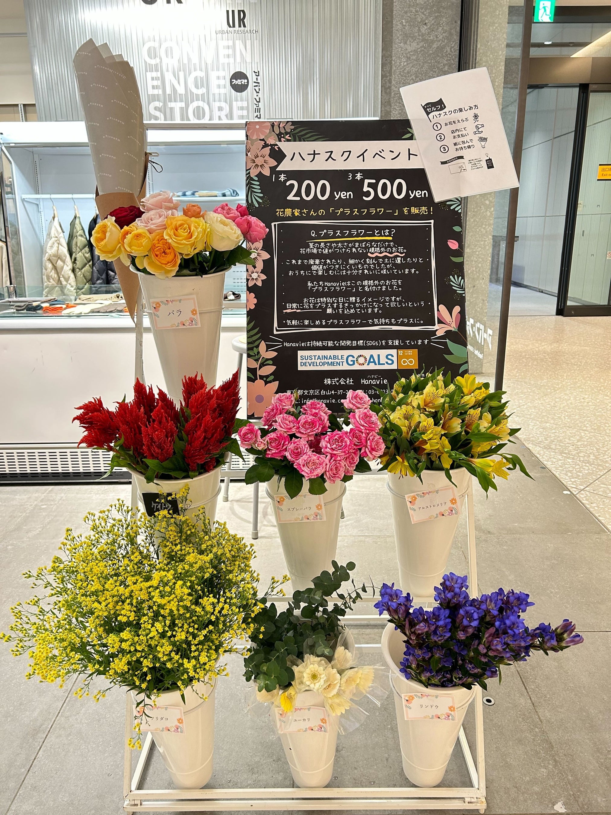 プラスフラワーの活用方法の代表例は「ハナスク」(=お花を飾って、花(ハナ)と農家さんを救(スク)おう!)です。異業種の店頭をお借りして、規格外の花を販売する取り組みです。1本200円、3本500円の定額販売で、誰もが気軽に花を手に取れる環境を提供しています。ハナスク以外では、SDGsやライフスタイルに関連するイベントでの単発での販売やワークショップ、イベントでのノベルティとしての配布、空間装飾など幅広い用途でも活用しています。