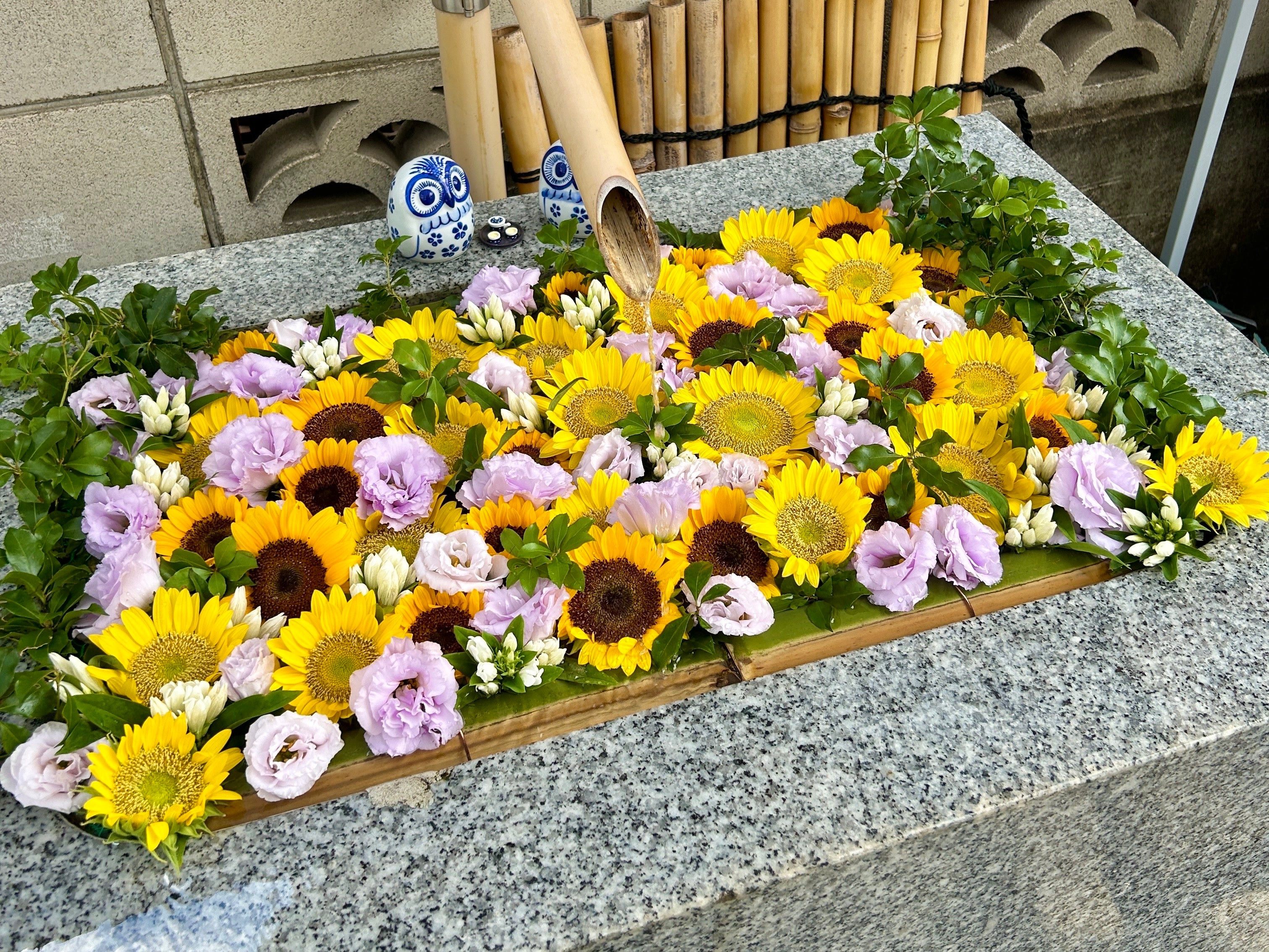 本来、手水舎は手や口を清めるために設けられたものですが、感染症予防のために使用を控える寺社が増える中、花を浮かべる花手水が急速に普及したとされています。茎を短く切り、花を水に浮かべる花手水のスタイルは、プラスフラワーとも好相性です。毎月1日に大神宮で行われる月首祭などにあわせて、定期的に季節のお花で彩ります。初回は8月1日の月首祭に合わせて、ヒマワリを中心に装花いたしました。