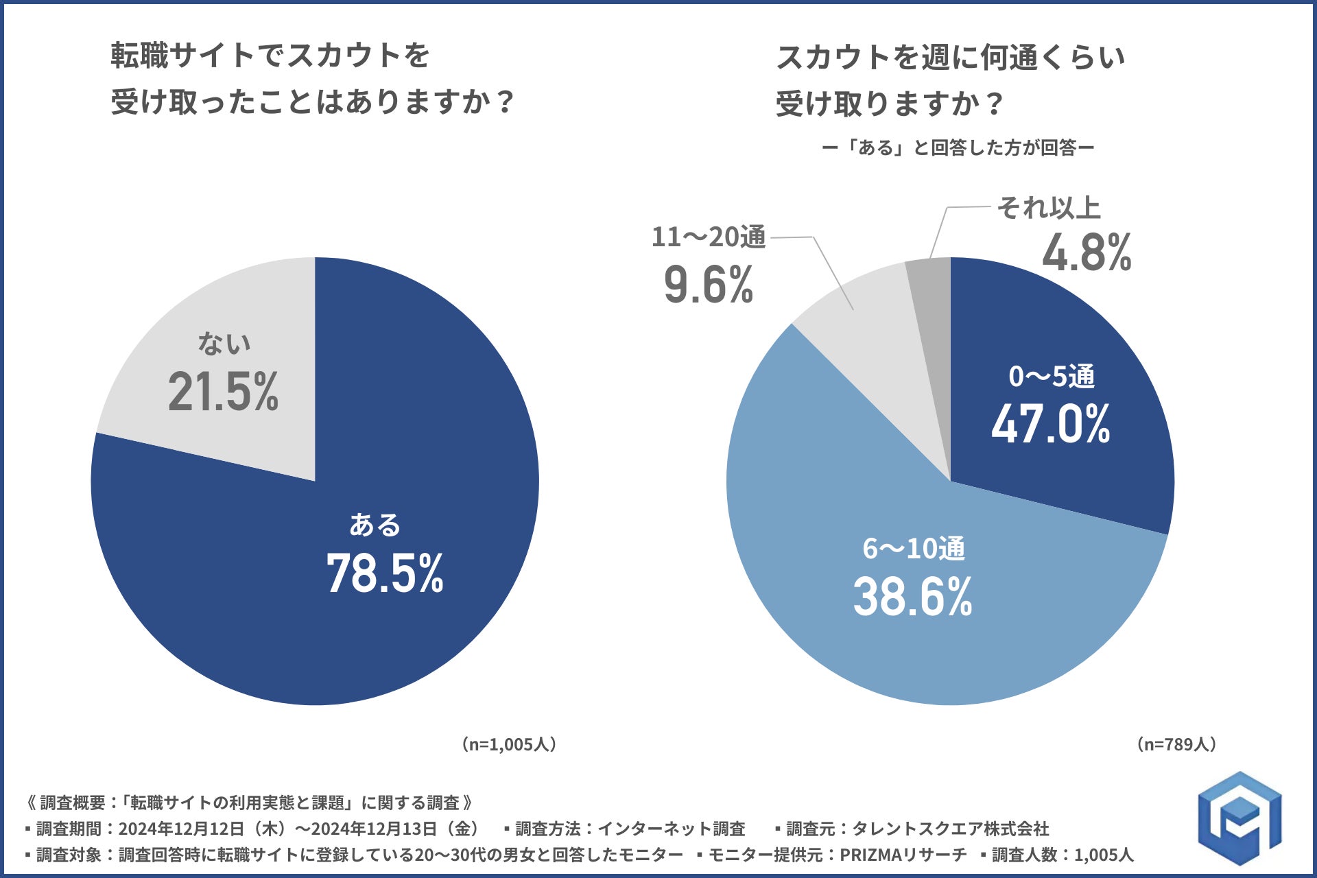 「転職サイトでスカウトを受け取ったことはありますか?」と質問したところ、約8割の方が『ある(78.5%)』と回答しました。
