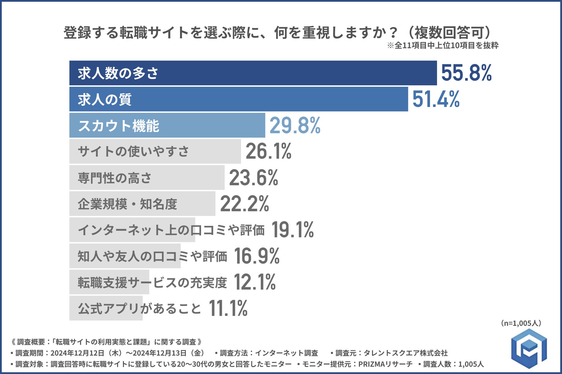 「登録する転職サイトを選ぶ際に、何を重視しますか?(複数回答可)」と質問したところ、『求人数の多さ(55.8%)』が最も多く、『求人の質(51.4%)』『スカウト機能(29.8%)』と続きました。