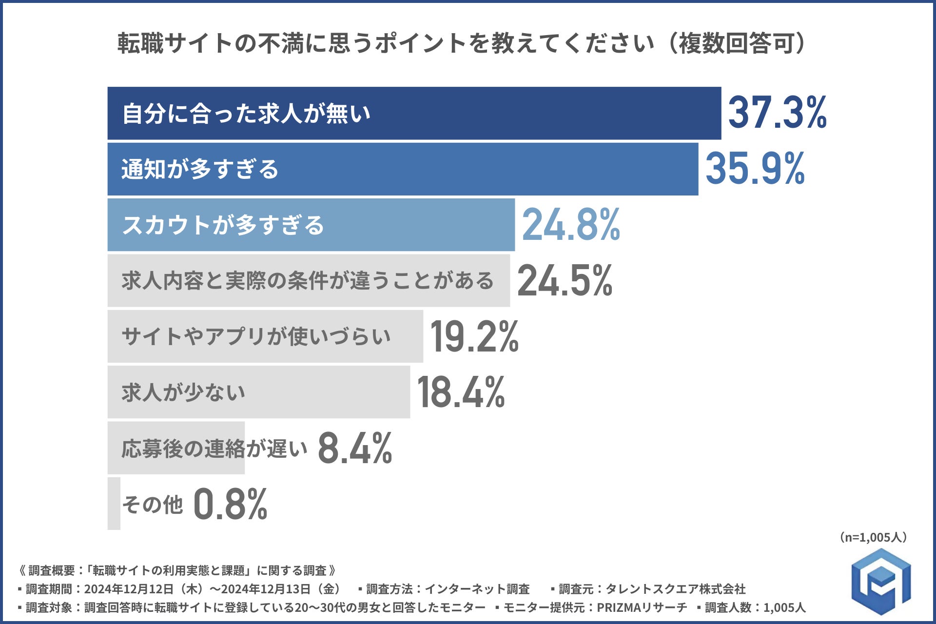 「転職サイトの不満に思うポイントを教えてください(複数回答可)」と質問したところ、『自分に合った求人が無い(37.3%)』が最も多く、『通知が多すぎる(35.9%)』『スカウトが多すぎる(24.8%)』と続きました。