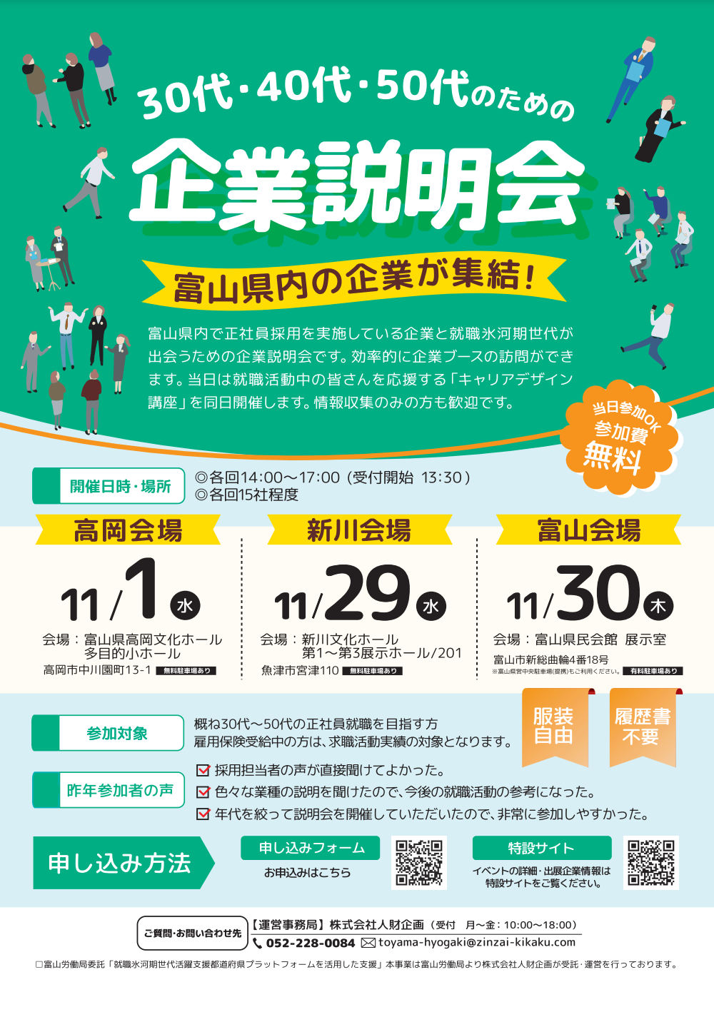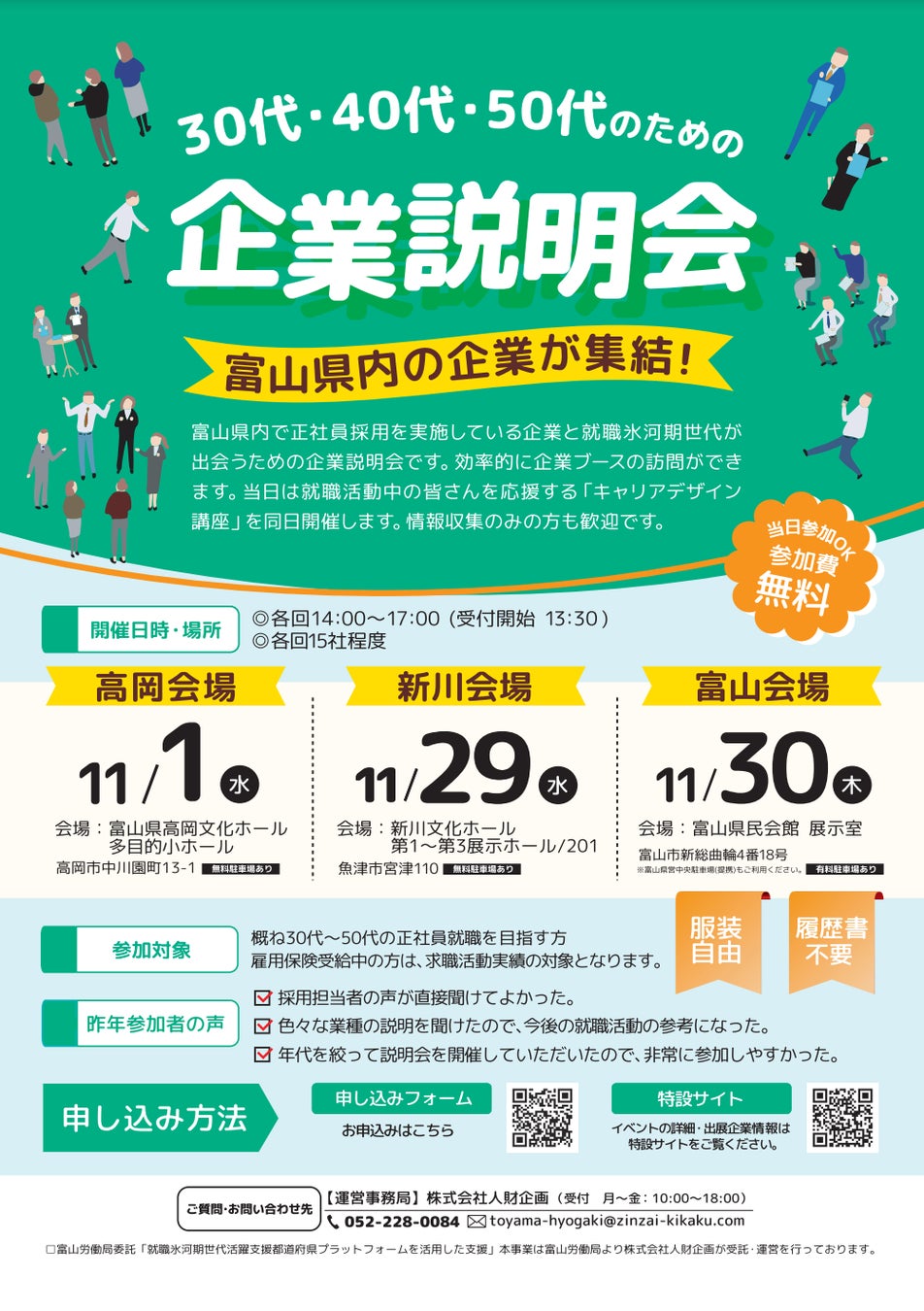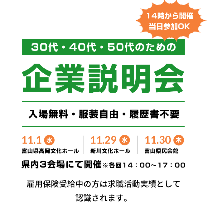 【正社員の仕事をお探しの方、必見!富山労働局主催だから安心】県内の企業が集結!30代・40代・50代のための企業説明会を開催します!【11/1(水)、29(水)、30(木)当日参加もOK】