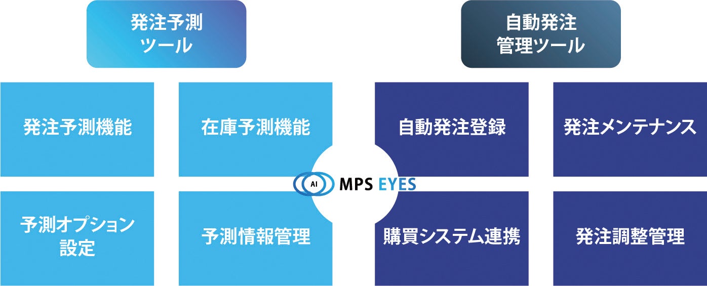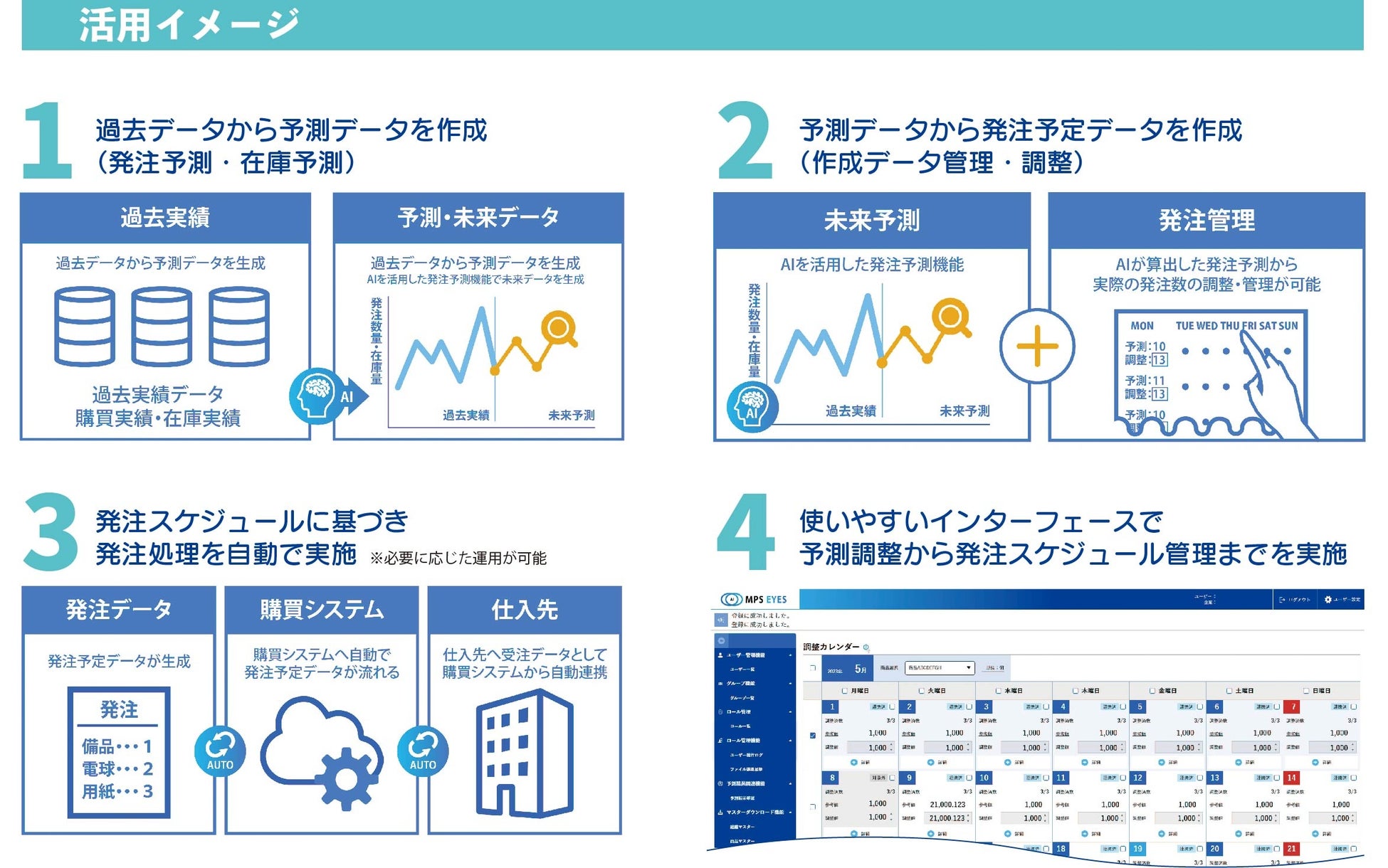購買業務に伴うそのような困りごとを解決できるのが、『MPS EYES』の未来購買管理・自動発注機能です。発注に必要な情報を予め生成することができるので、期限に追われることなく、通常業務の合間など時間のある時に購買業務が可能となります。さらにそのデータを基に発注を自動化することで、業務効率化・生産性向上を実現します。