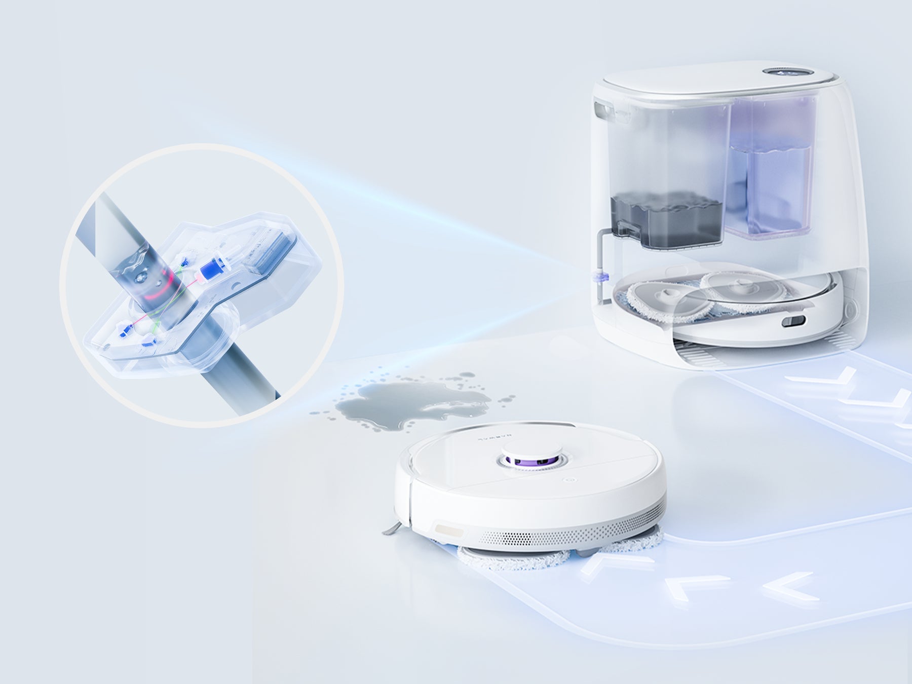 ボタンひとつで床掃除と水拭きを同時実行できます。高い吸引力でゴミを収集、加圧回転式のモップで床を磨き上げます。これだけではないのがNarwal Freoの最大の魅力!水拭きに使用したモップは、洗浄、乾燥まで自動で行います。モップの汚れに応じて専用の洗剤を自動投入、40℃の温風乾燥を行うので、手をかけずにモップは衛生的に保てます。床掃除からモップの手入れまで、すべておまかせです。