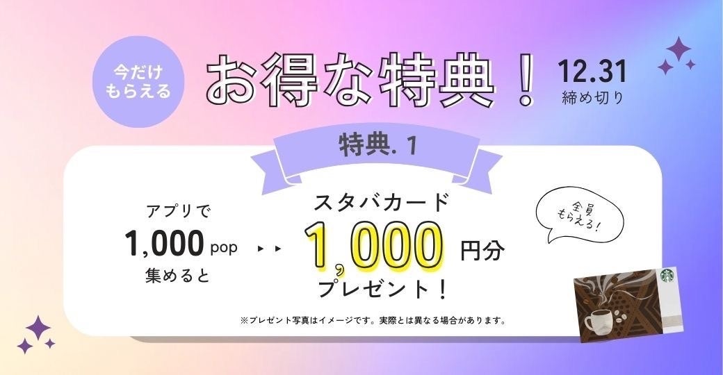 Popdishでは、2023年11月1日〜2023年12月31日の期間にPopdishアプリ内で1,000popを達成したPopmateにもれなくスタバカード1,000円分(eGift)をプレゼント️。