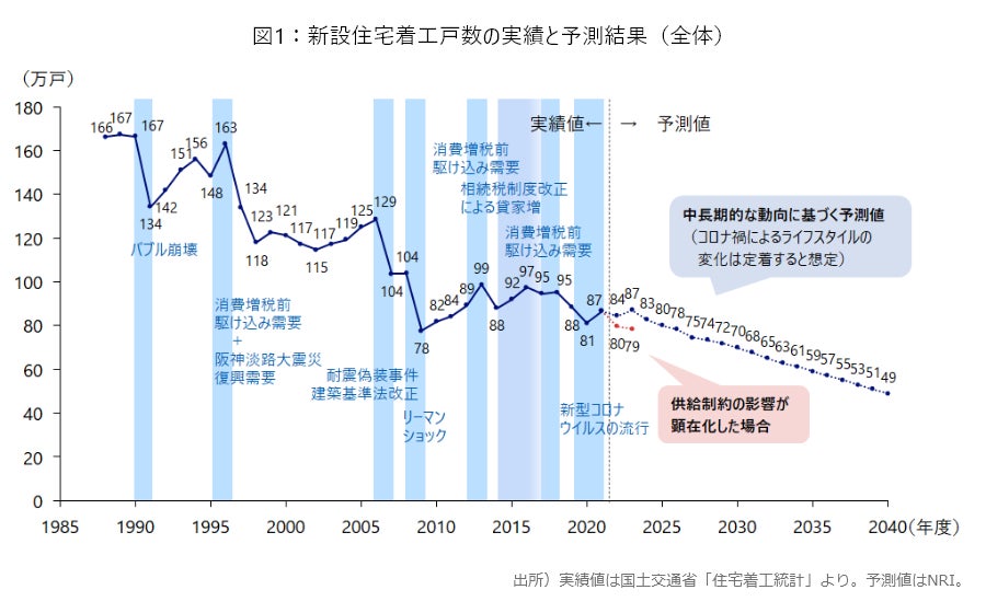 新築住宅着工棟数は2030年度には70万戸、2040年度には49万戸まで減少すると予想されています。(株式会社野村総合研究所調べ)