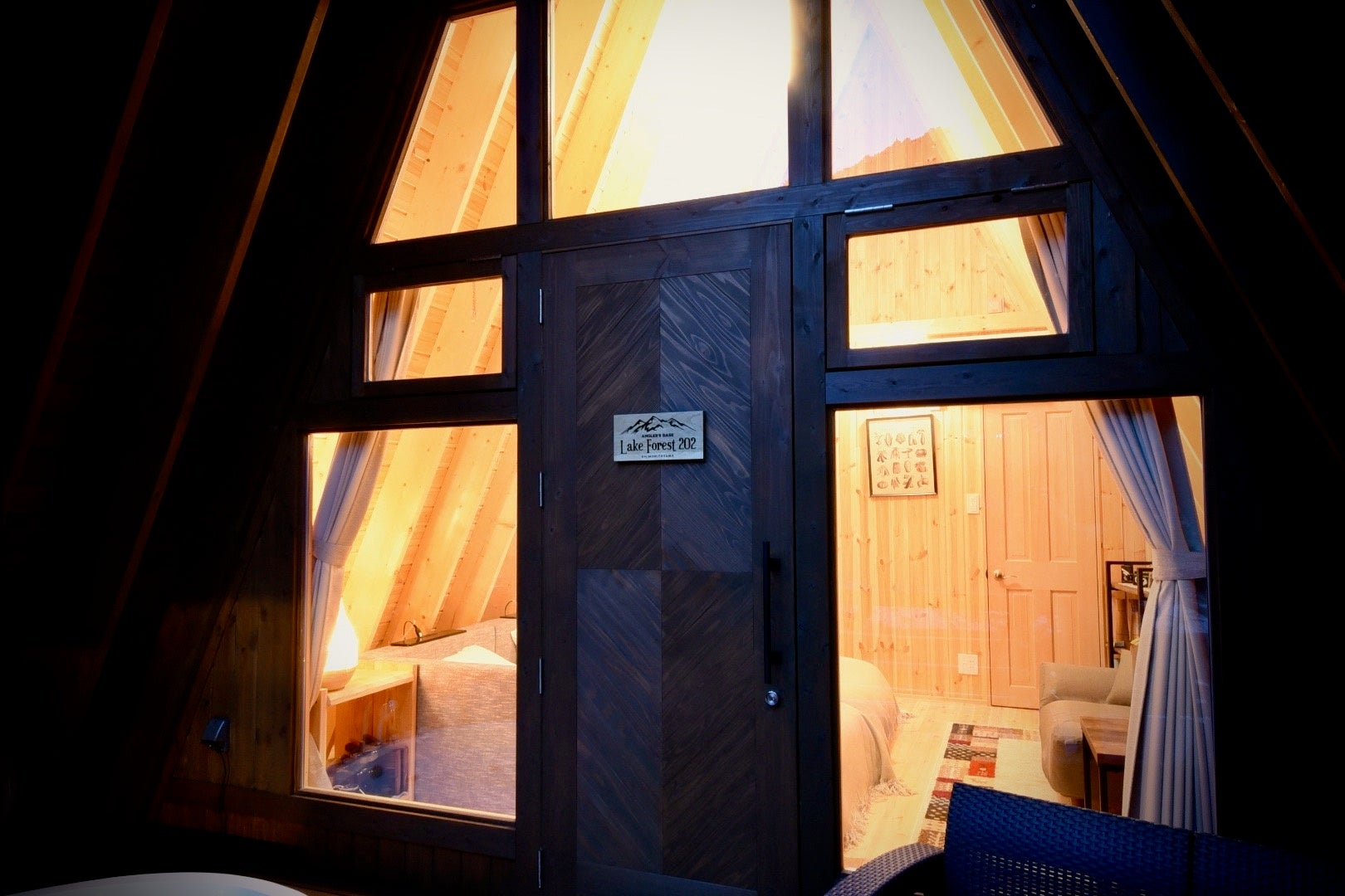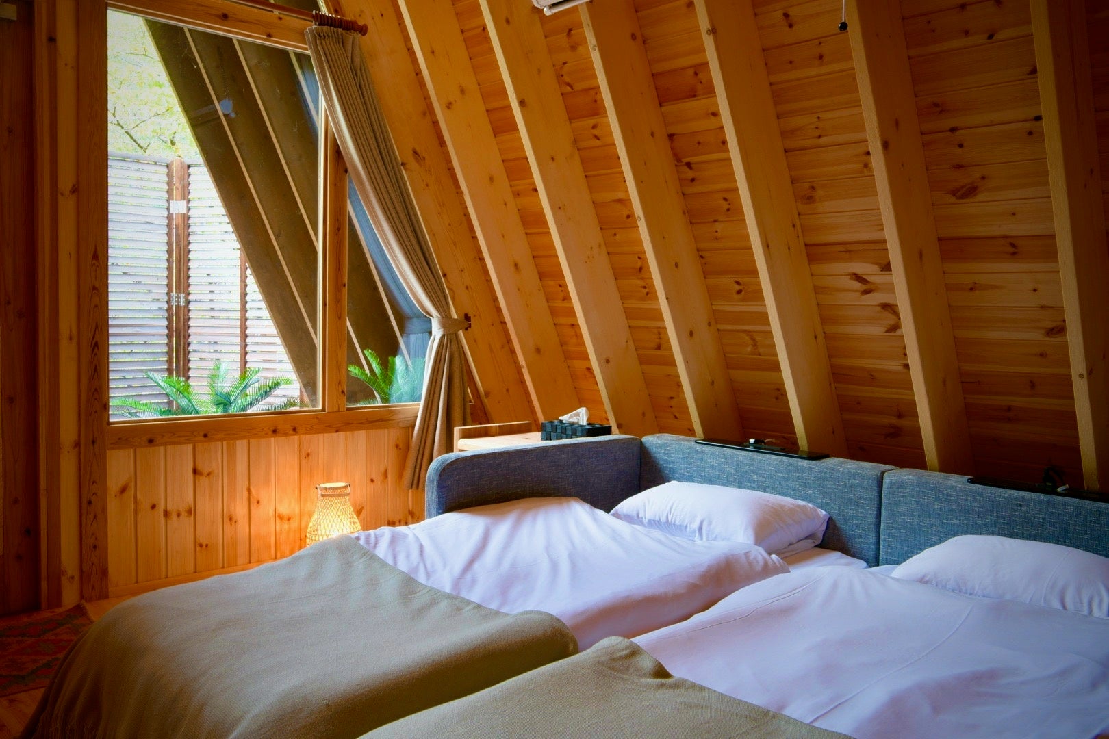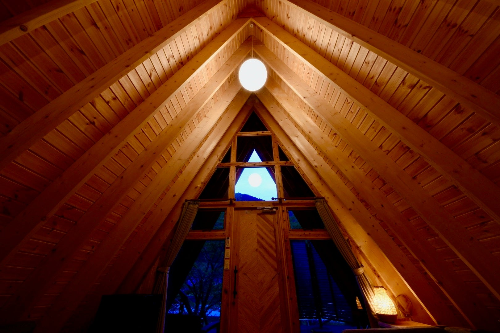 グランピングロッジはAフレームといわれる特殊な三角の形をしたウッドロッジとなっております。Aフレームとは、1960年台から北米を中心に建築されたアルファベットのAの形をした建物です。中でも特徴的なのが正面の壁面が丸ごと窓になっており、部屋の中から大自然を目一杯味わうことができます。