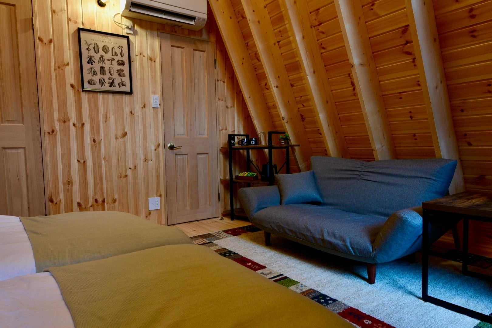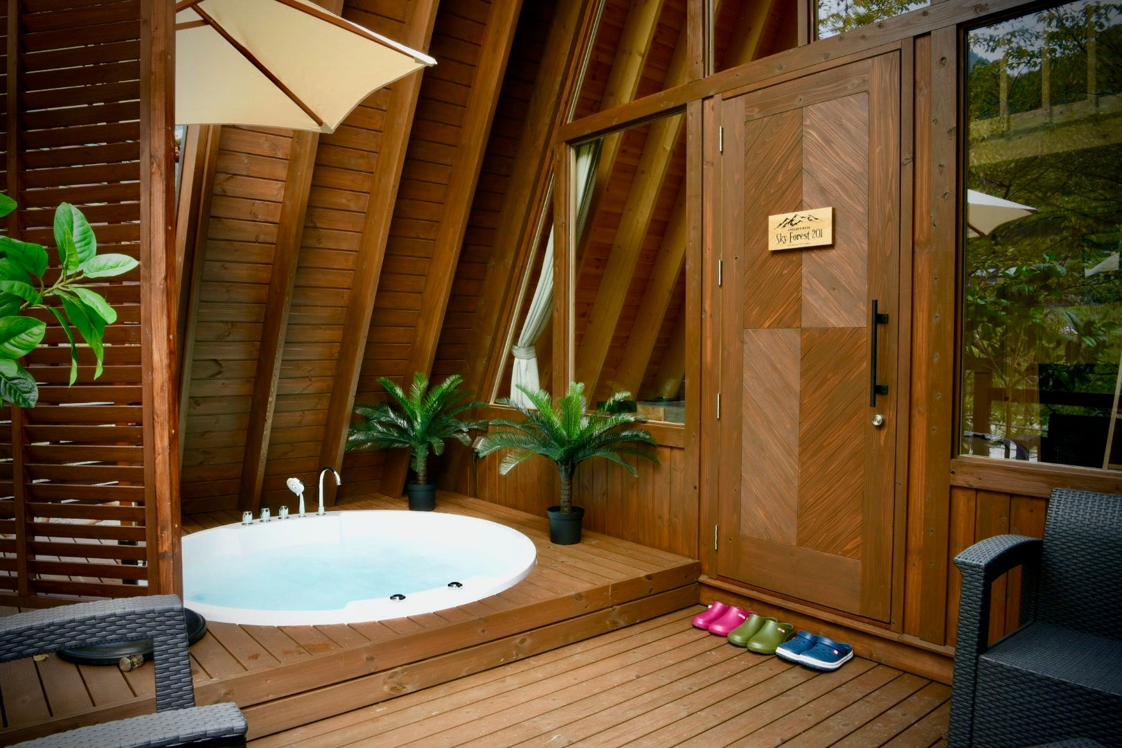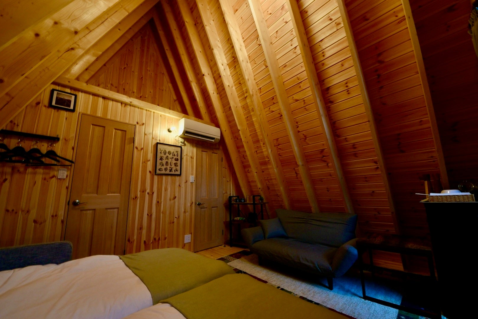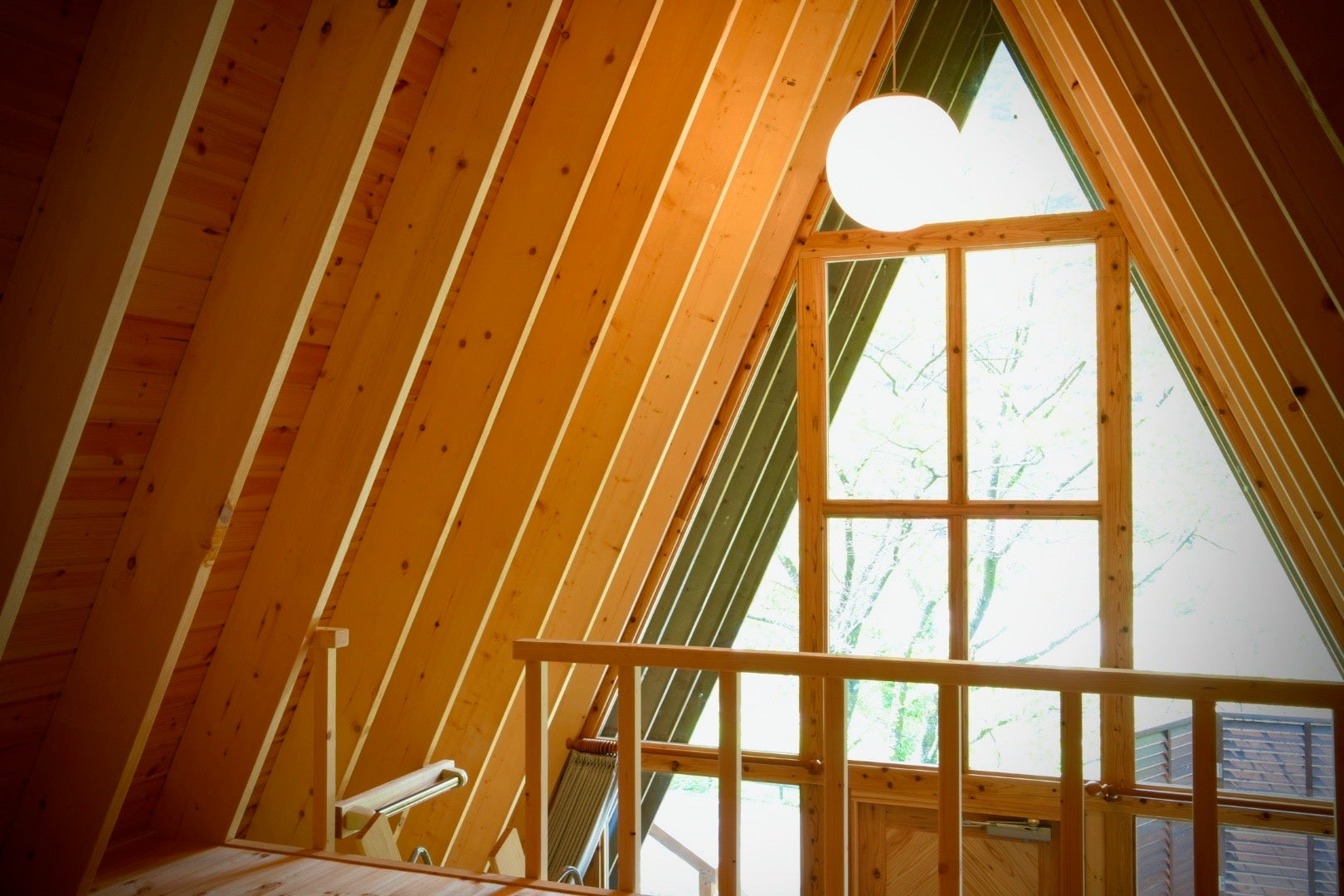 グランピングロッジはAフレームといわれる特殊な三角の形をしたウッドロッジとなっております。Aフレームとは、1960年台から北米を中心に建築されたアルファベットのAの形をした建物です。中でも特徴的なのが正面の壁面が丸ごと窓になっており、部屋の中から大自然を目一杯味わうことができます。