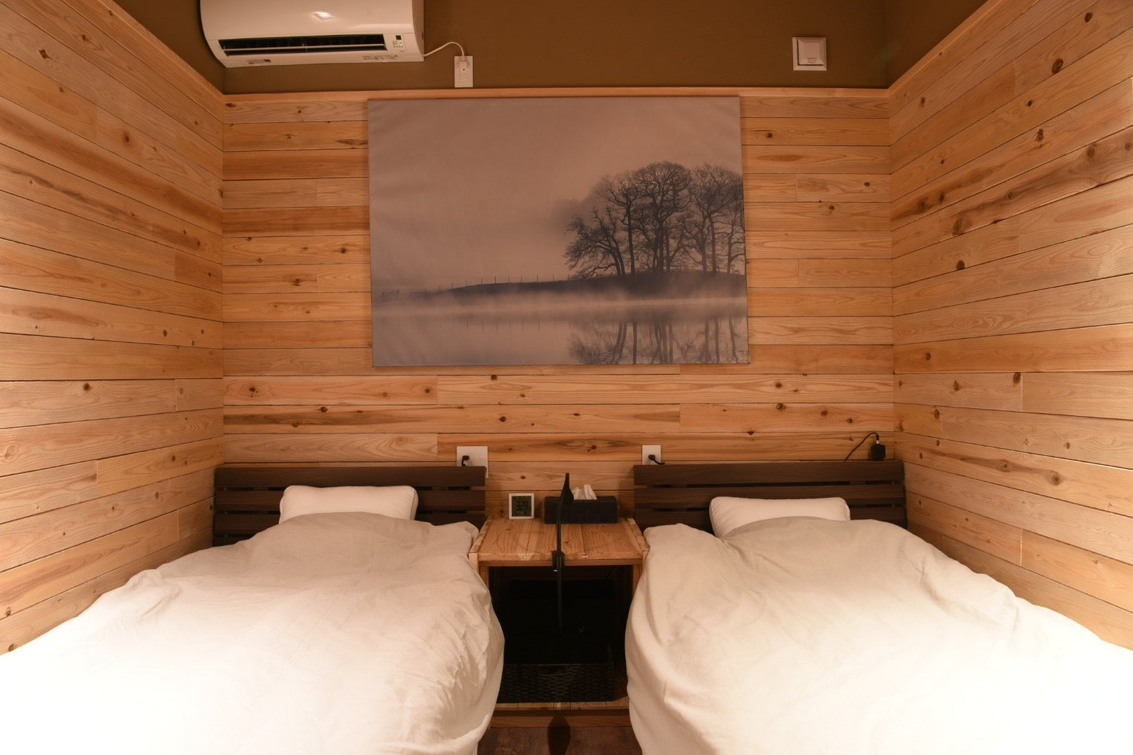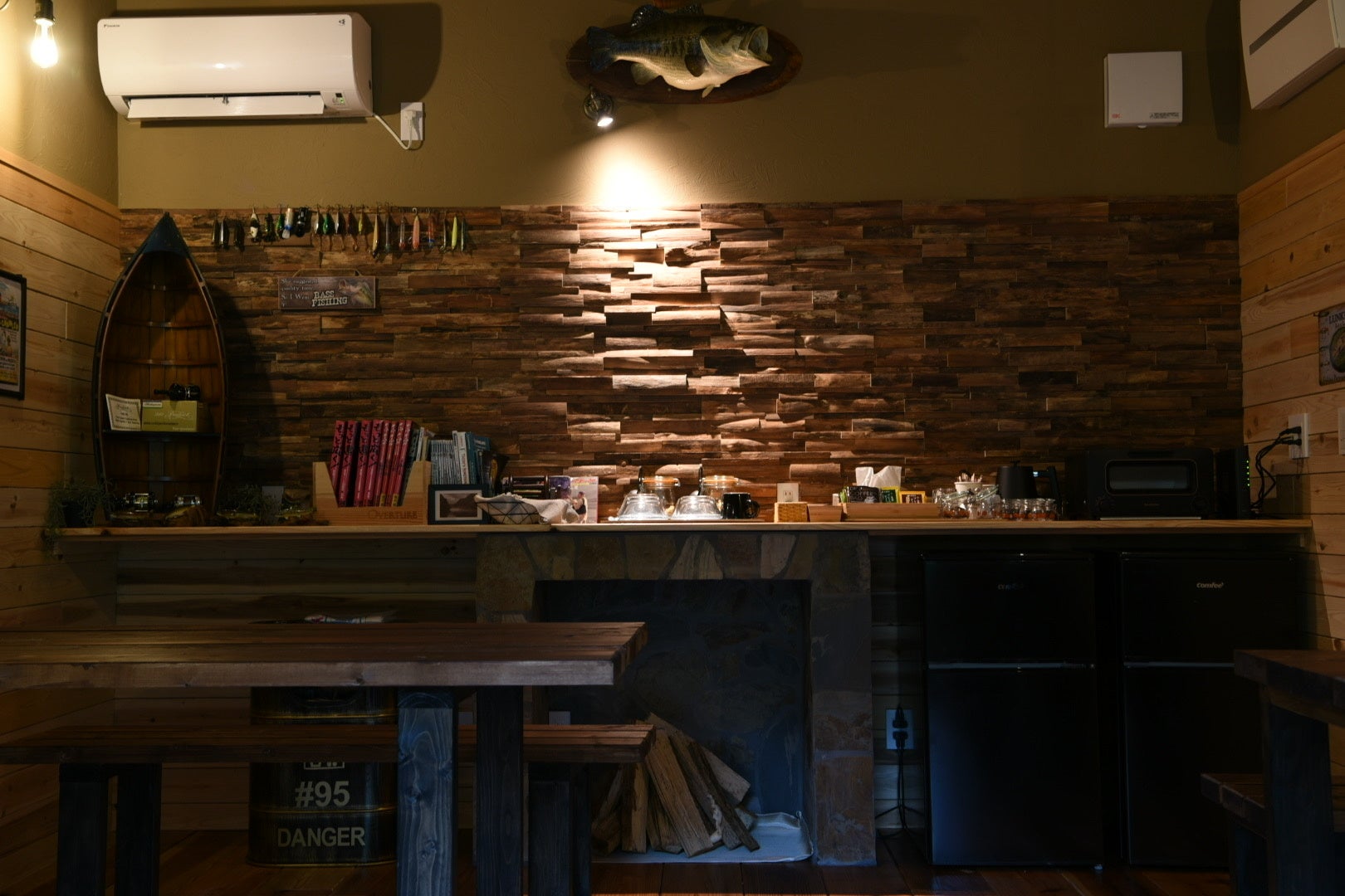 フィッシングロッジのコンセプトはその名の通り「釣り人の基地」をコンセプトとした宿泊施設となっています。バスフィッシングの本場北米の雰囲気を基調としたデザインに設計しています。内装には、ヴィンテージの釣具や釣り雑貨を多数展示しております。構造は杉材を使用したウッドロッジとなっており、ウッドを基調とした内装・外装によってより自然を味わうことのできる空間を創りました。