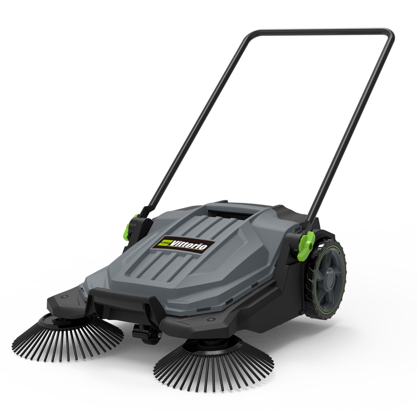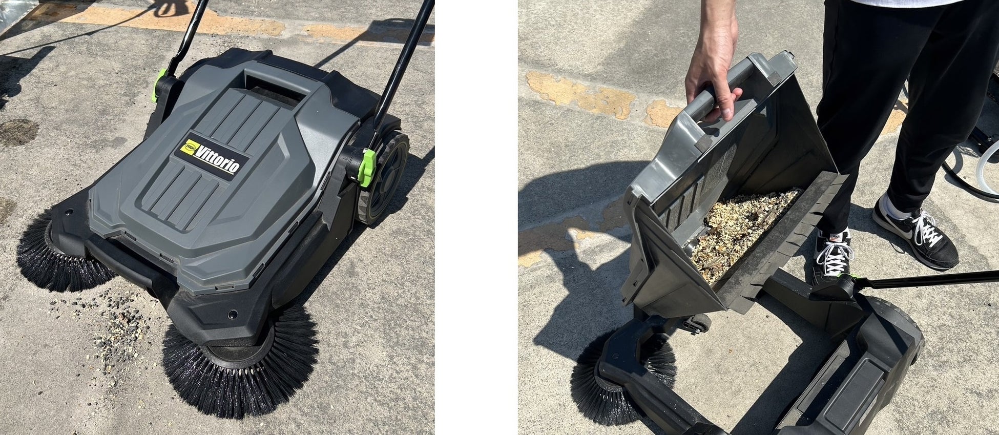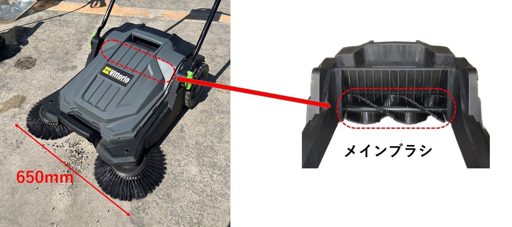 これまでVittorioシリーズでは高圧洗浄機をメインで取り扱いをしておりましたが、あらゆる汚れにトータルサポートする蔵王産業として今回「スイーパー」をリリースいたします。スイーパーは、普段掃除をする際に使用している「ほうき」と「ちりとり」を一体化したものです。家周りはもちろん、施設周り、工場や農園などの落ち葉や砂、ゴミの回収が製品を押して歩くだけで回収できます。かき集め、回収という動作が要らず、ごみの上を押して通り過ぎるだけなので、清掃時間を大幅に短縮できます。20Lのダストホッパー、機械両サイドに回転ブラシ、機械中央にメインブラシを搭載しております。