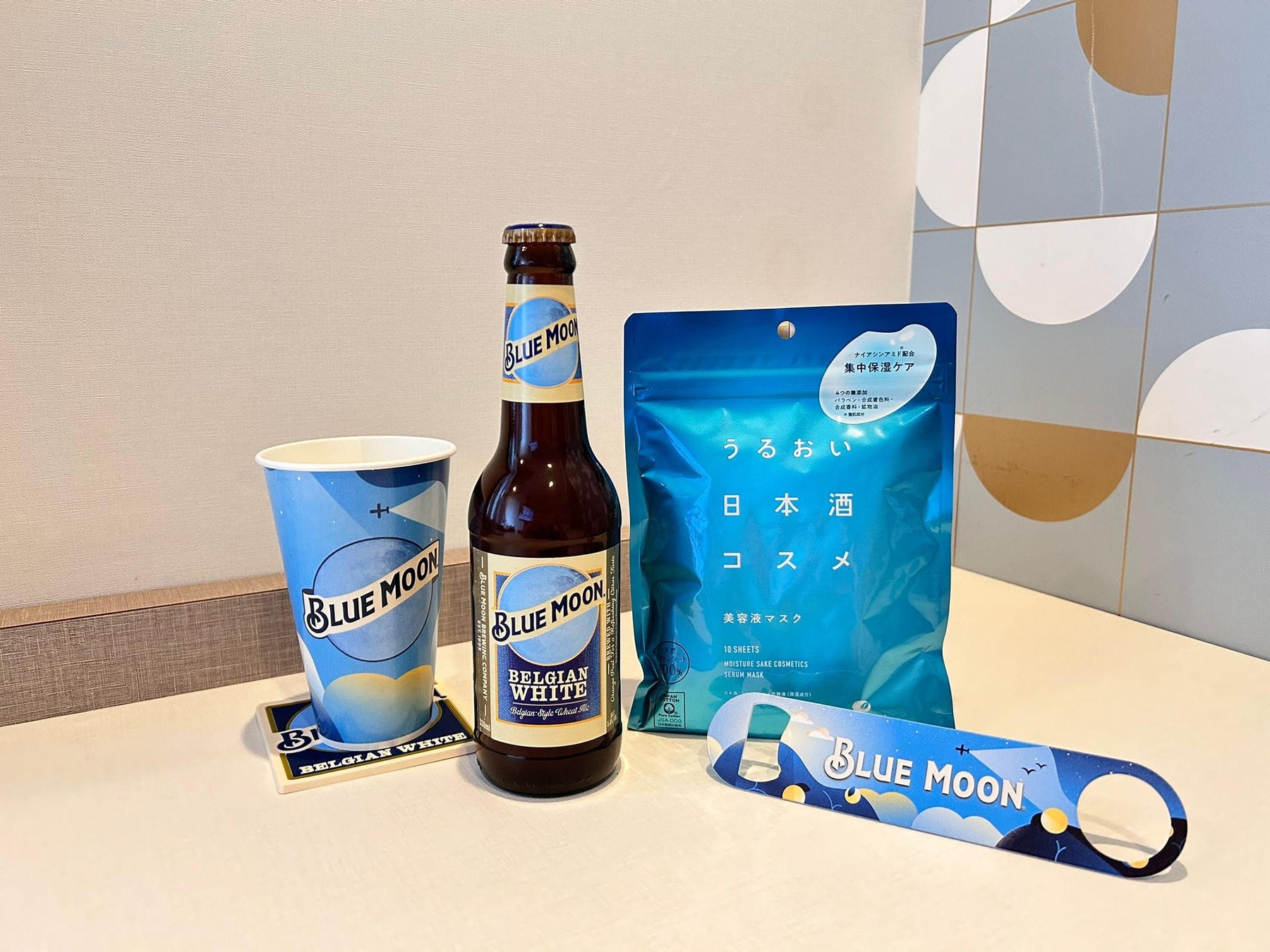 白鶴酒造が展開する、いま話題のクラフトビール「BLUE MOON」をはじめ、オリジナルオープナーも付いて、開ける瞬間からホワイトエールビールの香り豊かな風味をお楽しみいただけます。また、白鶴酒造の日本酒をふんだんに使った、お部屋でゆっくりお肌をケアできる「うるおい日本酒コスメ 美容液マスク」もプレゼントします。