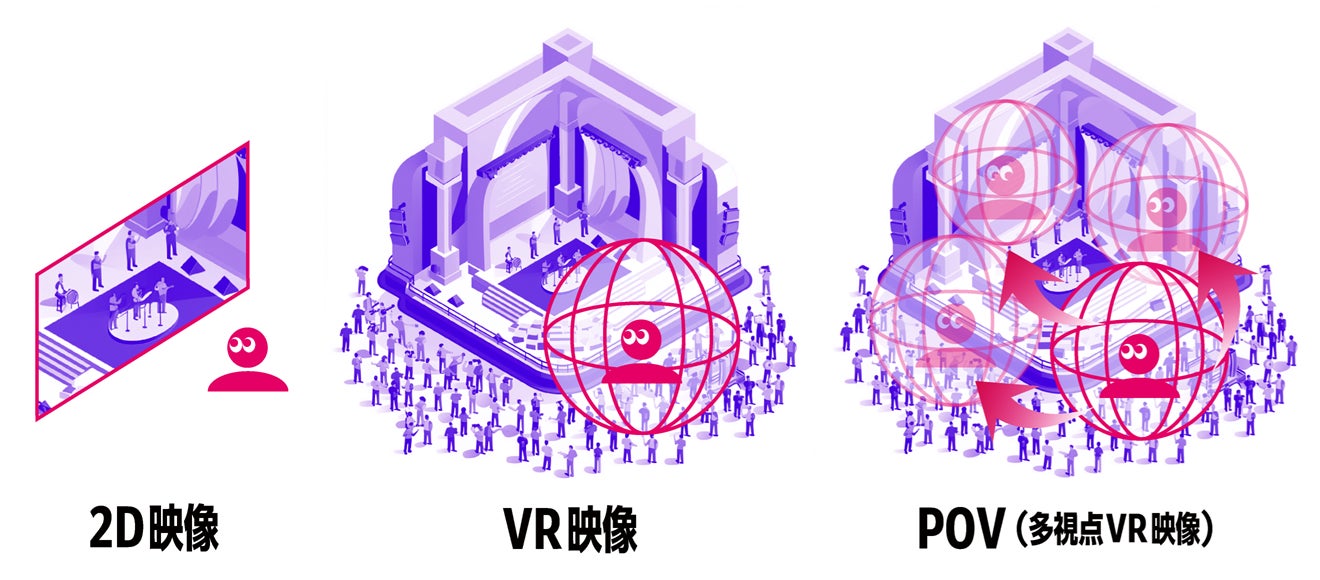 360度全天球映像は前後左右天地と空間のすべてが映像に記録されており、VRヘッドセットで視聴することによって極めて没入感の高い体験が得られます。『POV』では360度全天球映像を複数視点で収録しており、自分の好きな視点に移動しながらライブパフォーマンスを楽しむことができます。その場で観ているかのような没入感に加え、自ら視点やアングルをコンロトールできるプロアクティブなVR映像体験になっています。