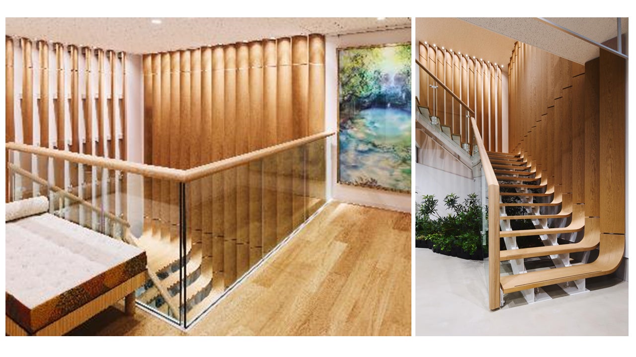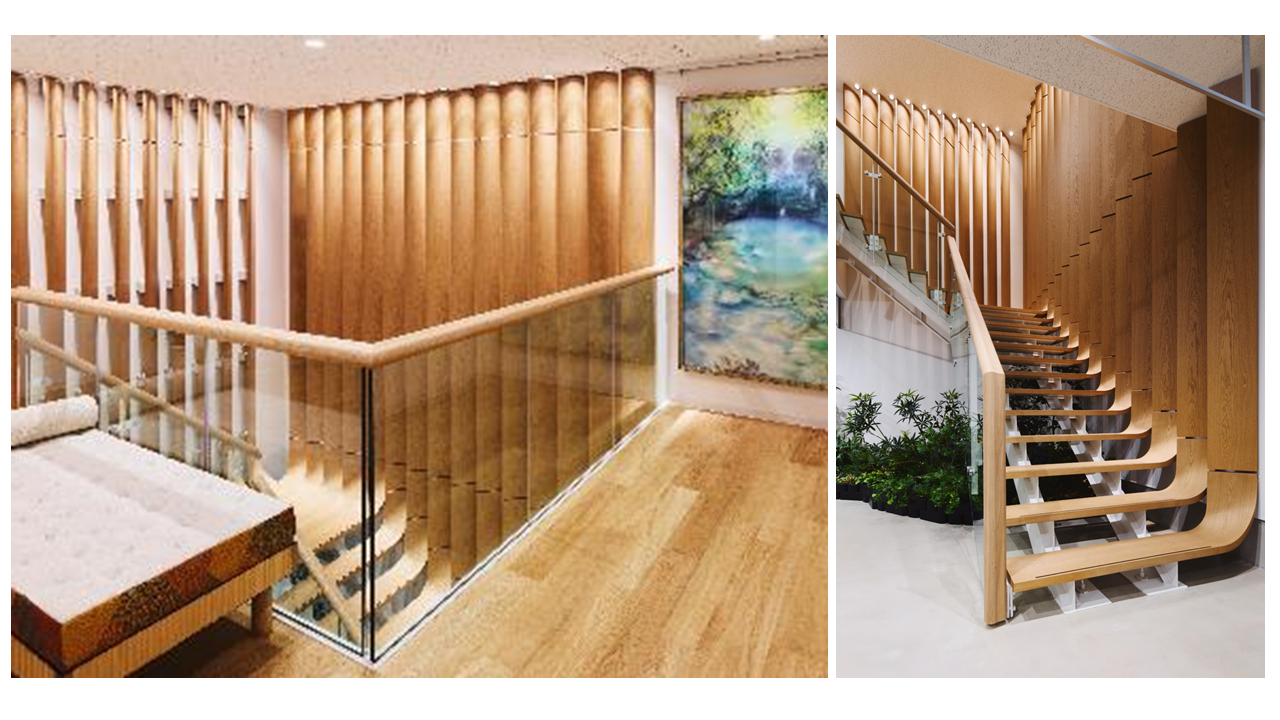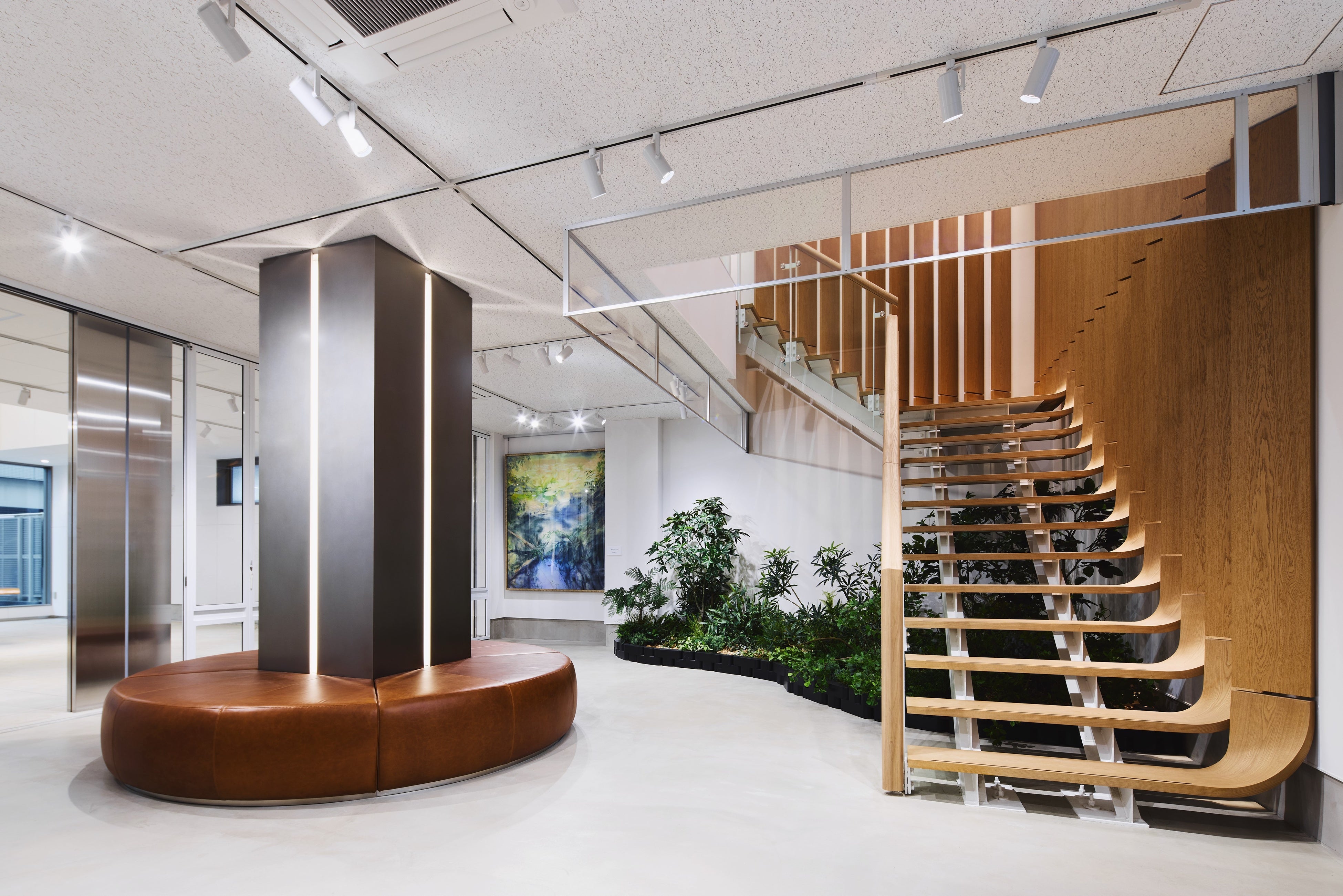 上海藤建家具が制作した曲げが特徴的な踏板、江間忠木材株式会社の協力のもと製作した壁面の不燃ボーダーなど、素材の選定や納まりに加え、所轄行政・消防機関の確認事項を踏まえ、内装材の不燃性能を含め、安全性に配慮した設計・施工を行いました。