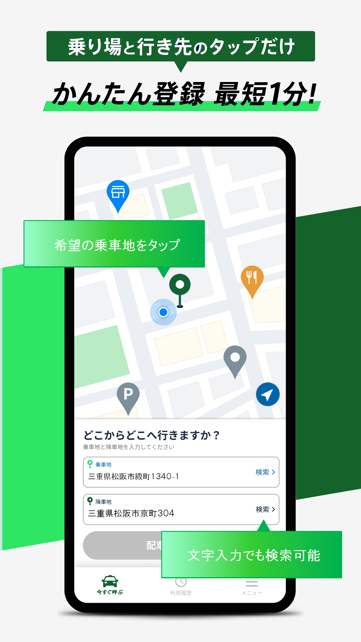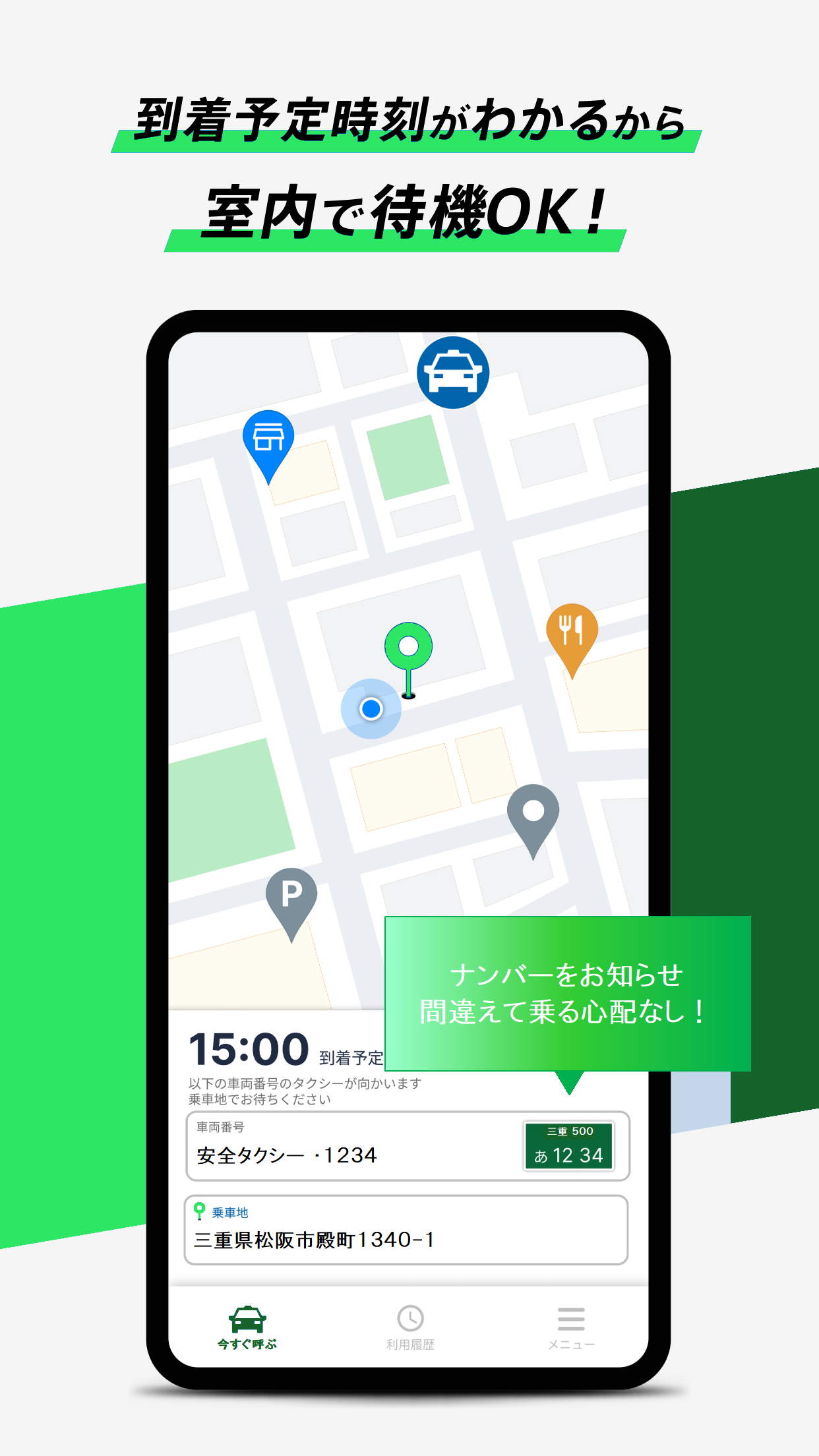 「安全タクシーアプリ」は三重県津エリア・松阪エリア・伊勢エリア・鳥羽エリアにて安全タクシーグループのタクシーを配車できる専用配車アプリです。
