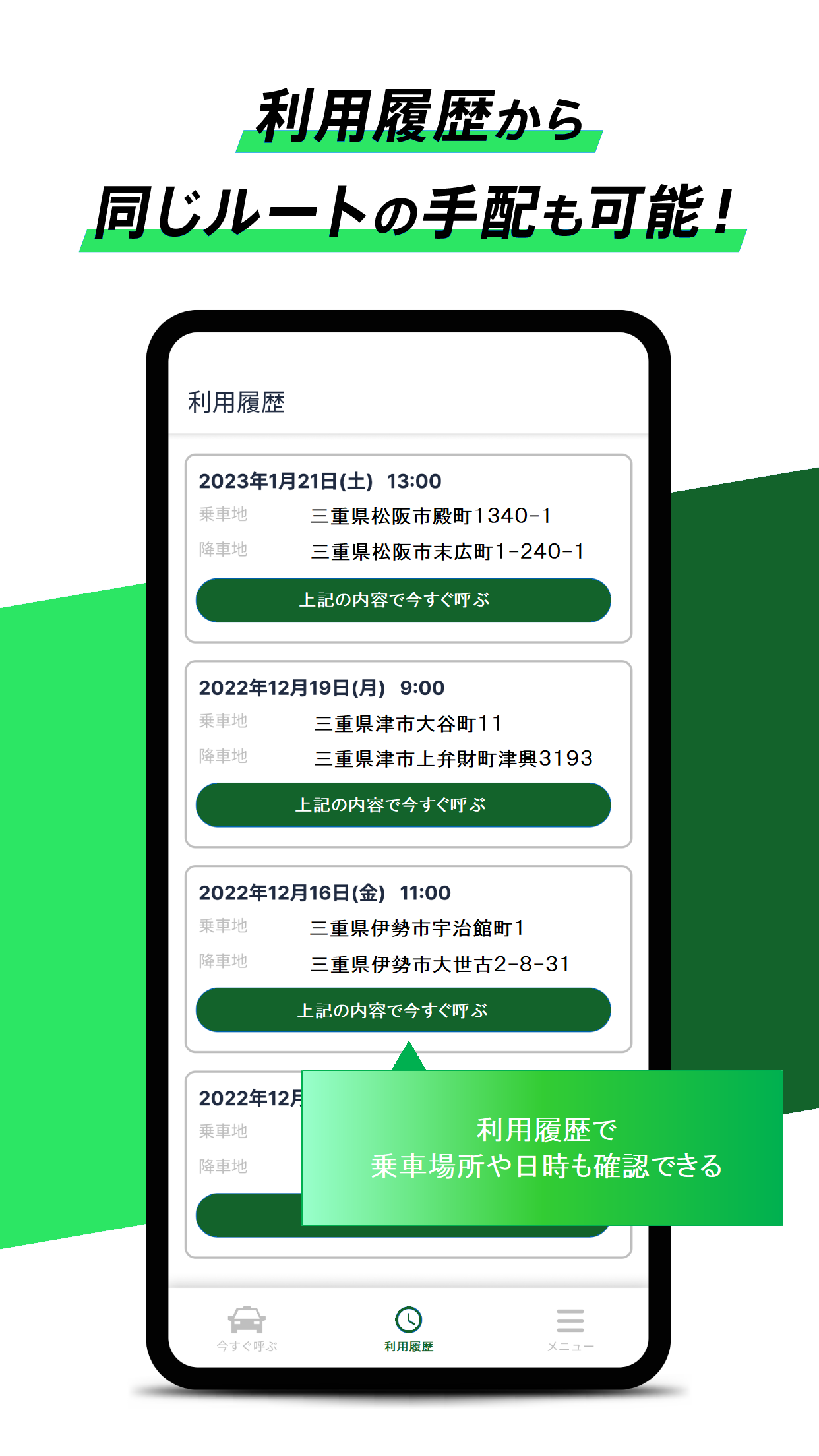 利用履歴から過去の利用実績の情報を確認することができます。さらに利用履歴から同じルートを予約することも可能です。