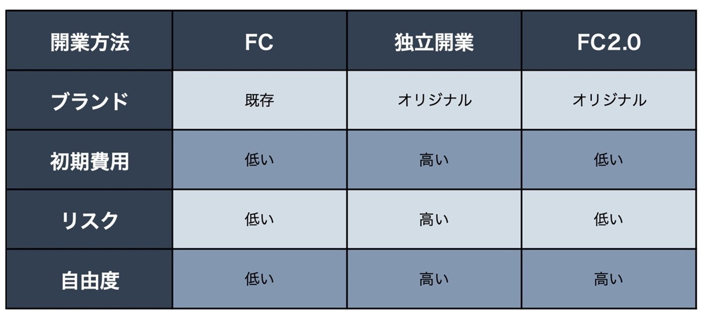 「独立して自分の店を持つ」というのは多くの美容師が持つ夢です。その際に、「社内で独立するなら会社の色を守らないといけない」、「自分の理想をカタチにする店舗を開業するなら会社を辞めないとできない」という問題が上がります。自身で独立開業する場合、資金面がクリアできて、個人で店舗を立ち上げられたとしても、巨大なマーケットの中では立場が弱く、仕入れルートの確保や管理部門の新設をはじめ、様々な壁が立ちはだかります。当社は今まで、優秀な人材が、個人店舗の経営で苦戦する姿を見てきたことで、そういった彼らの”夢”をあきらめさせない、支援をしたいという想いから、『FC2.0』制度が誕生しました。フランチャイズと独立開業のいいとこ獲りをした時代に合わせた独立支援制度で、資金面での負担が少なく、リスクが小さいフランチャイズ加盟店でありながら、自由度の高さが特徴です。独立志望の美容師の希望を叶えることができ、かつエリアやターゲット、それらに伴ったコンセプトを明確にした店舗になることで、既存ブランドでは対応できないお客様のニーズに応えることができます。