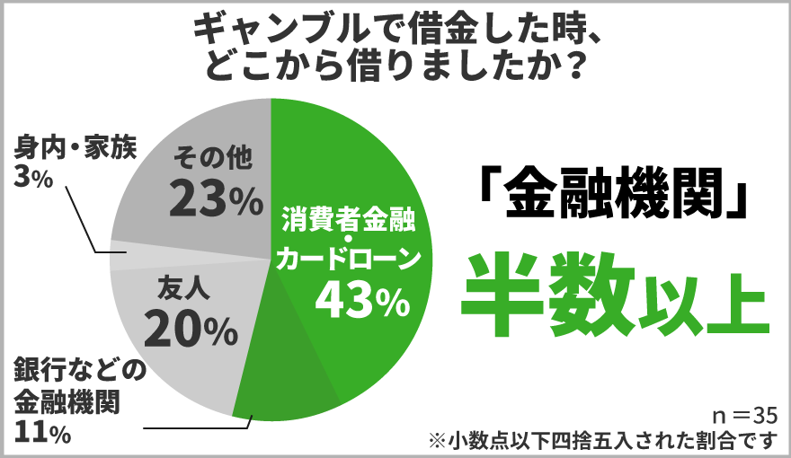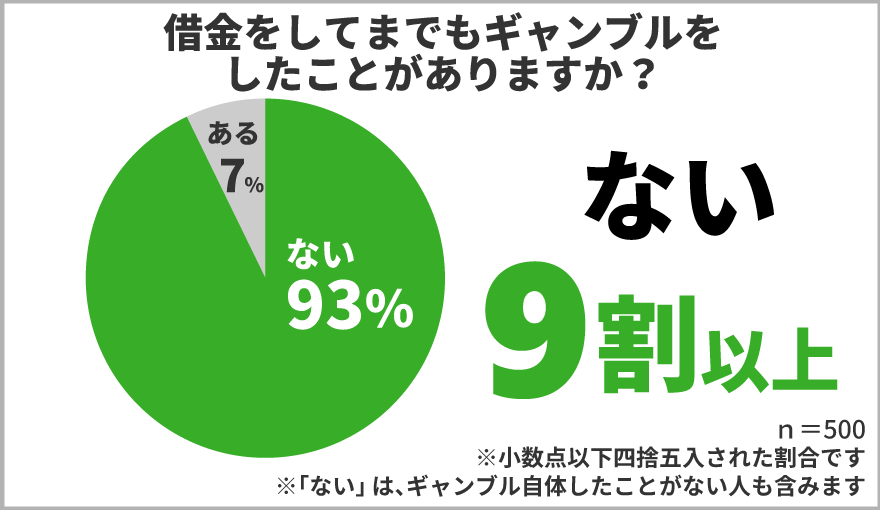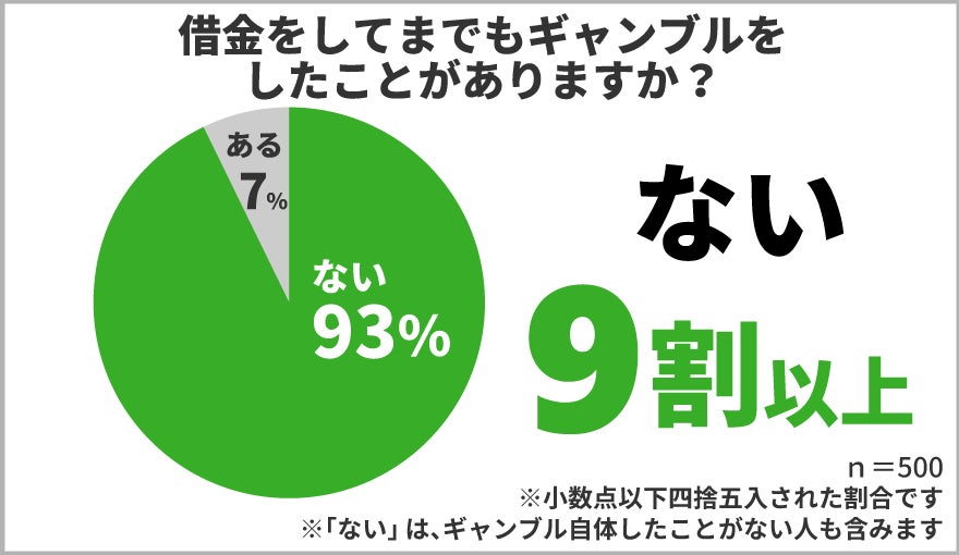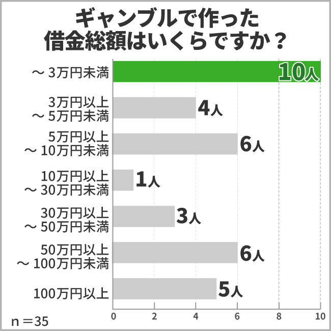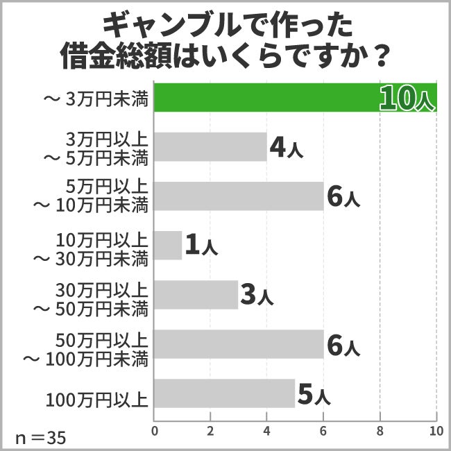 しかし、「ギャンブルをしたことがある」と答えた 317人のうち、35人が「借金をしてまでギャンブルをした」と回答。この場合、約1割以上の方が、ギャンブルにはまり借金をしてしまったってしまったという結果に!
