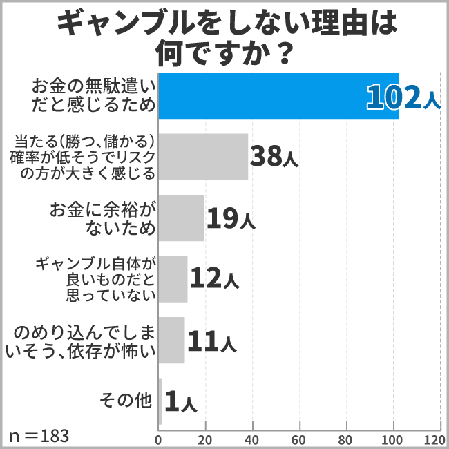 今回のアンケートでは、「ギャンブルをしたことがない」という方に「なぜギャンブルをしないのか?」についても質問しています。
