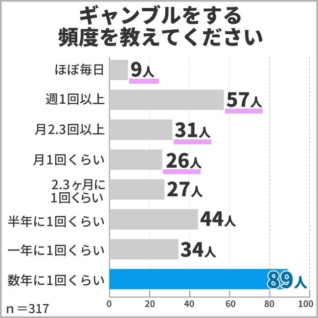 実際に、「ギャンブルをしたことがある」と答えた方に、どれくらいの頻度でギャンブルをするのかを聞いてみました。