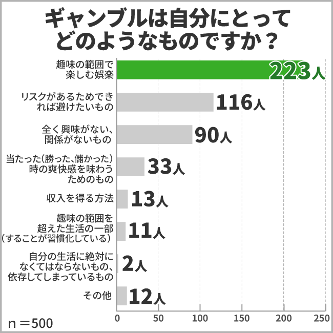 そんな「ギャンブル」が自分にとってどういった位置づけのものであるのかや、ギャンブルで儲かった・損をしたエピソードなどについて、男女500人にアンケートを取りました。