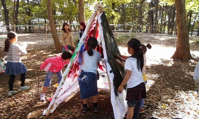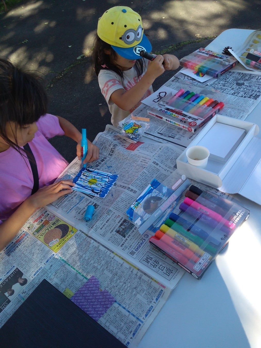 また他にも、缶バッジ作りやテントの布面に墨汁で絵を描くワークショップや、ミニ紙芝居づくりワークショップなど、親子で楽しめるワークショップが目白押しです!