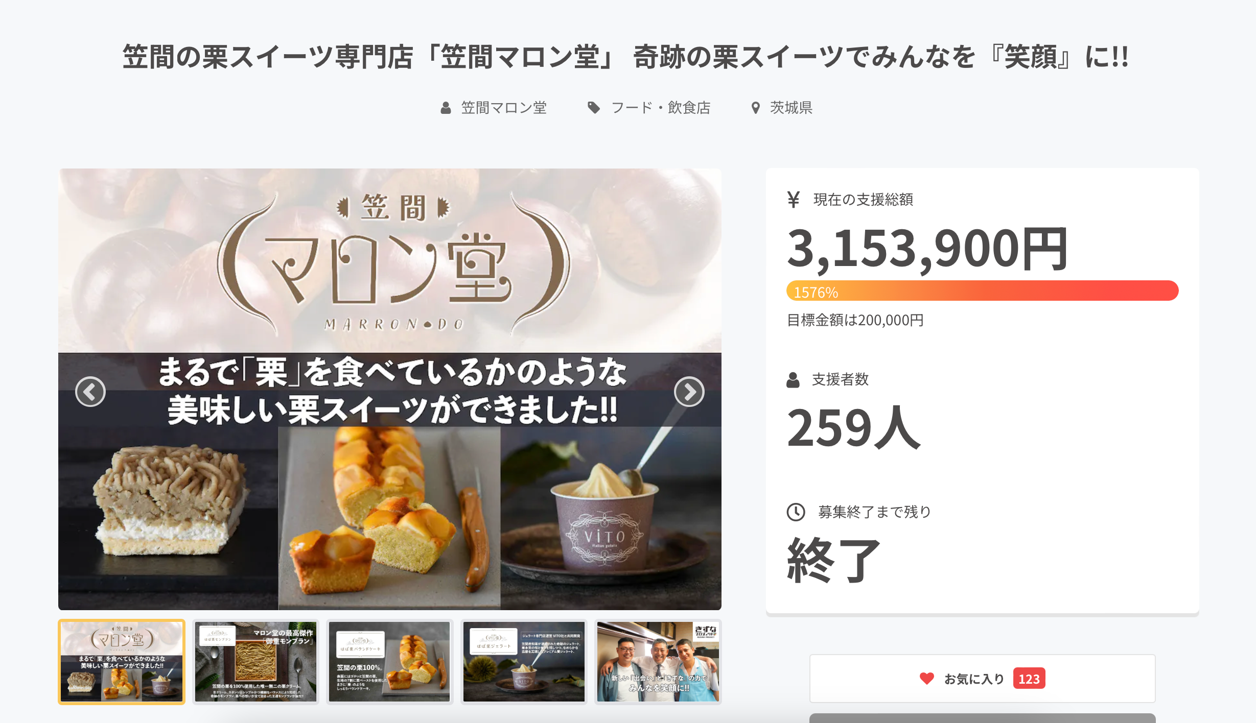 笠間マロン堂は、2023年8月より、クラウドファンディングで「ほぼ栗スイーツ」全3種を先行販売。皆様のお陰で当初の目標金額を大幅に超え、1500%を達成。大きな期待をいただいた事を受けて商品の改良を重ね、2023年10月18日(水)からオンラインショップをオープンし、沢山の皆様に「笠間の栗」のスイーツをお楽しみいただけるよう公式販売を開始します!