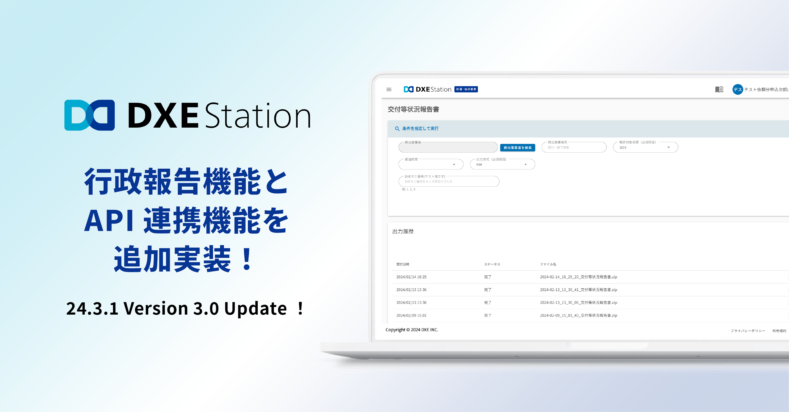 『DXE Station』、行政報告機能とAPI連携機能を追加しVer.3.0へアップデート!『DXE Station電子契約』も新バージョン(Ver.2.3)へ