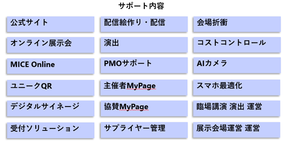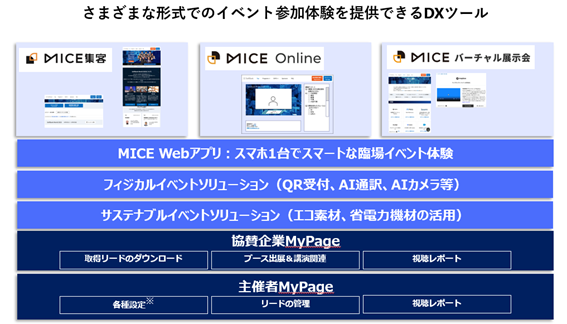 「MICEソリューションズ」は、MICEプラットフォームが提供する集客管理サービス「MICE運営」や動画配信プラットフォーム「MICE Online」、バーチャル展示会を実現する「MICEバーチャル展示会」、その他の管理システムを基に開発したサービスです。