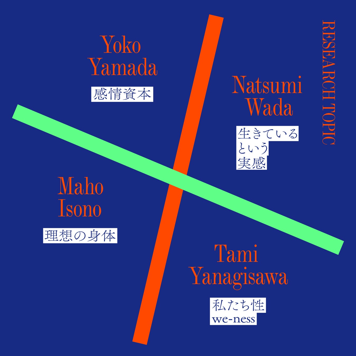 研究を進めるにあたり、それぞれが「21世紀の理想の身体」「『私たち性 we-ness』の不在とその希求」「ポストヒューマン時代の感情資本 」「『生きているという実感』が灯る瞬間の探求」を研究テーマに設定。「いま私たちはどんな時代を生きているのか」という問いについて、探求を続けてきました。