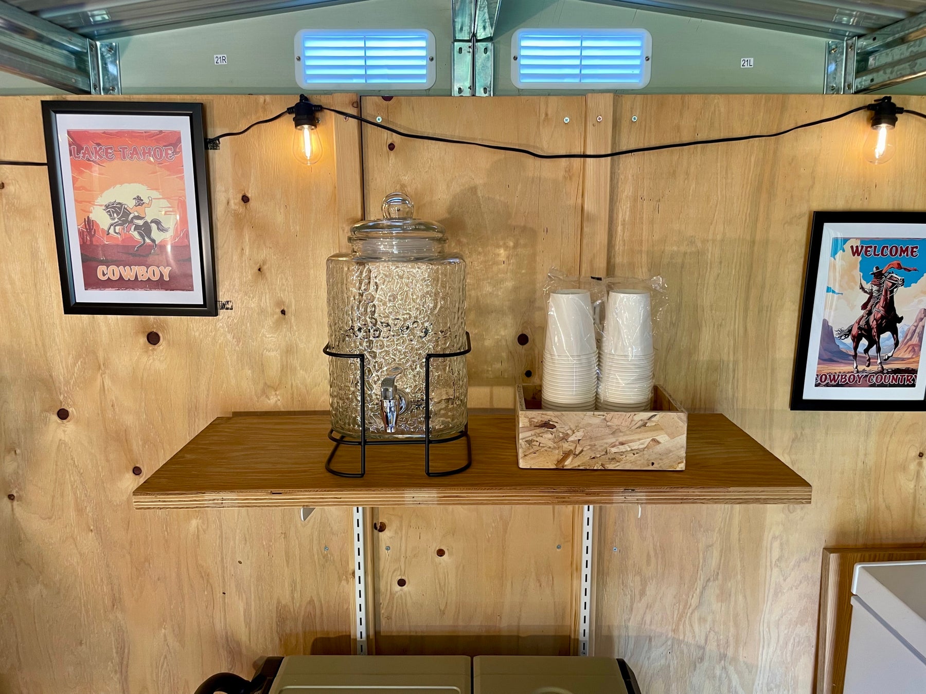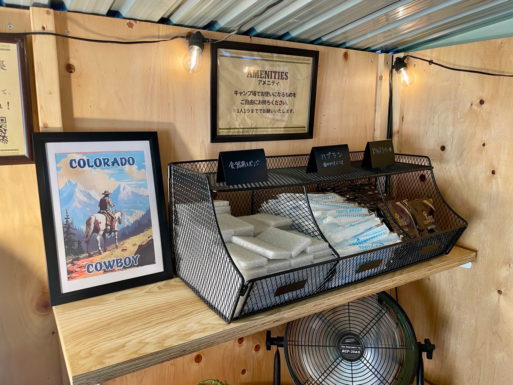 キャンプ場では珍しい、ホテルにあるようなウェルカムブースを設置。中ではウェルカムドリンクを楽しみつつ、あると便利な歯ブラシなどのアメニティ類、自由に読める図書コーナー、テントに持っていけるボードゲームなどのサービスが充実。